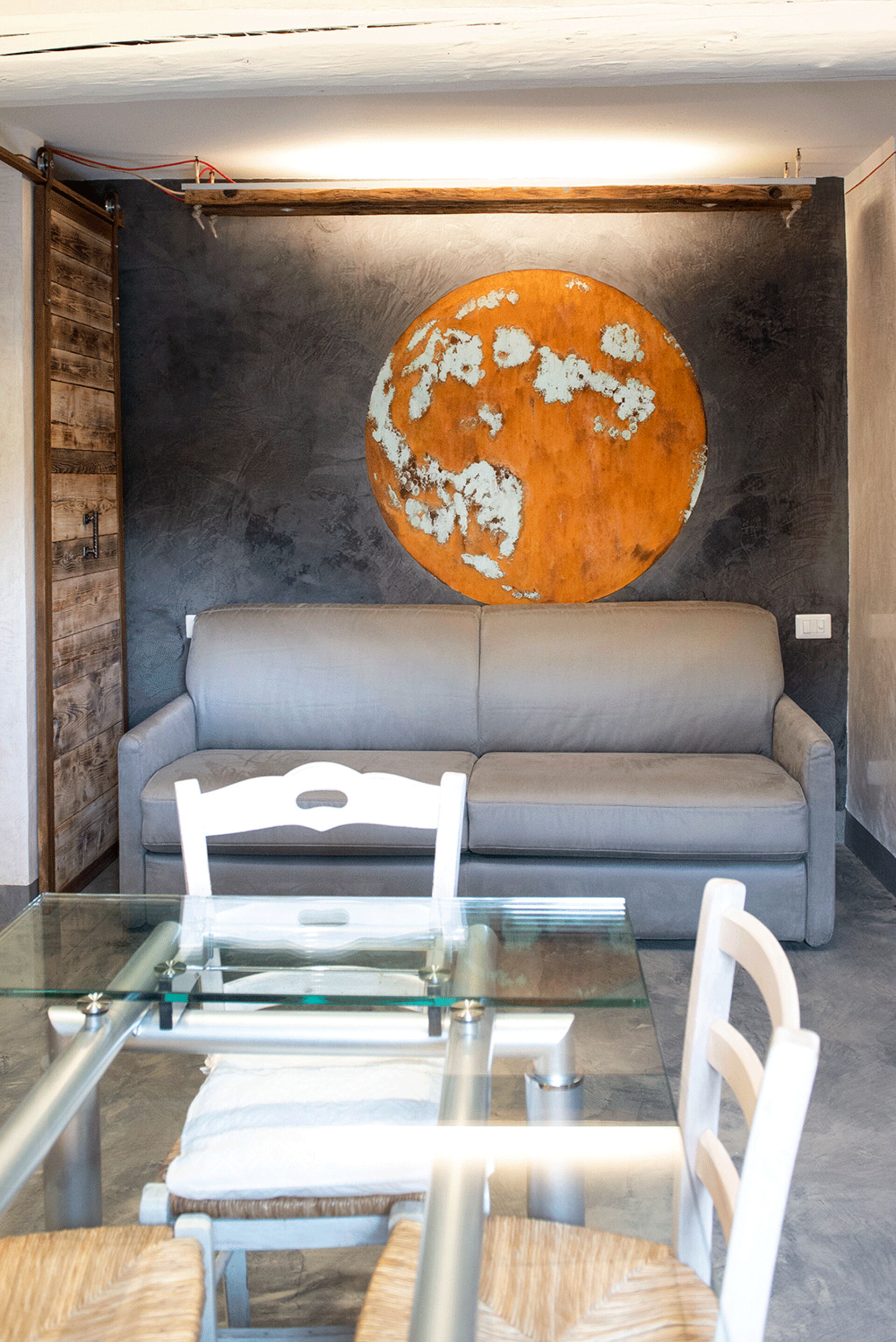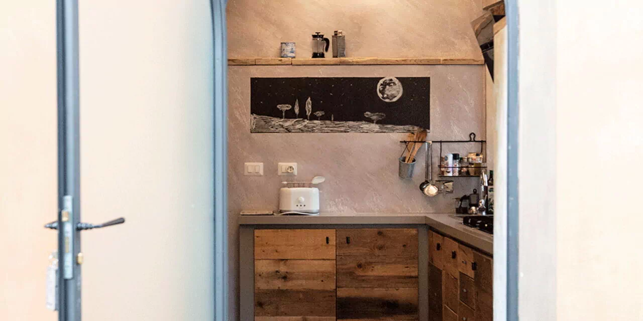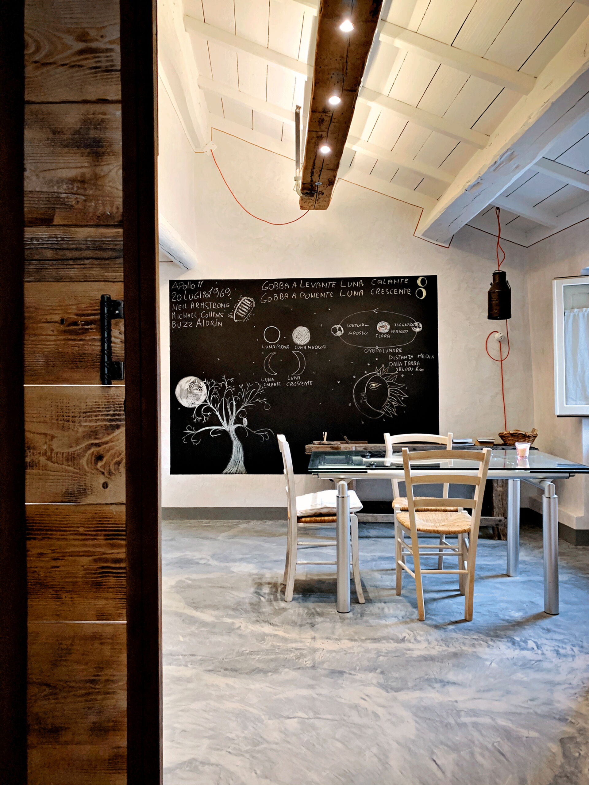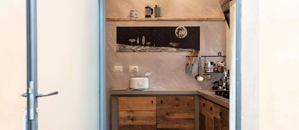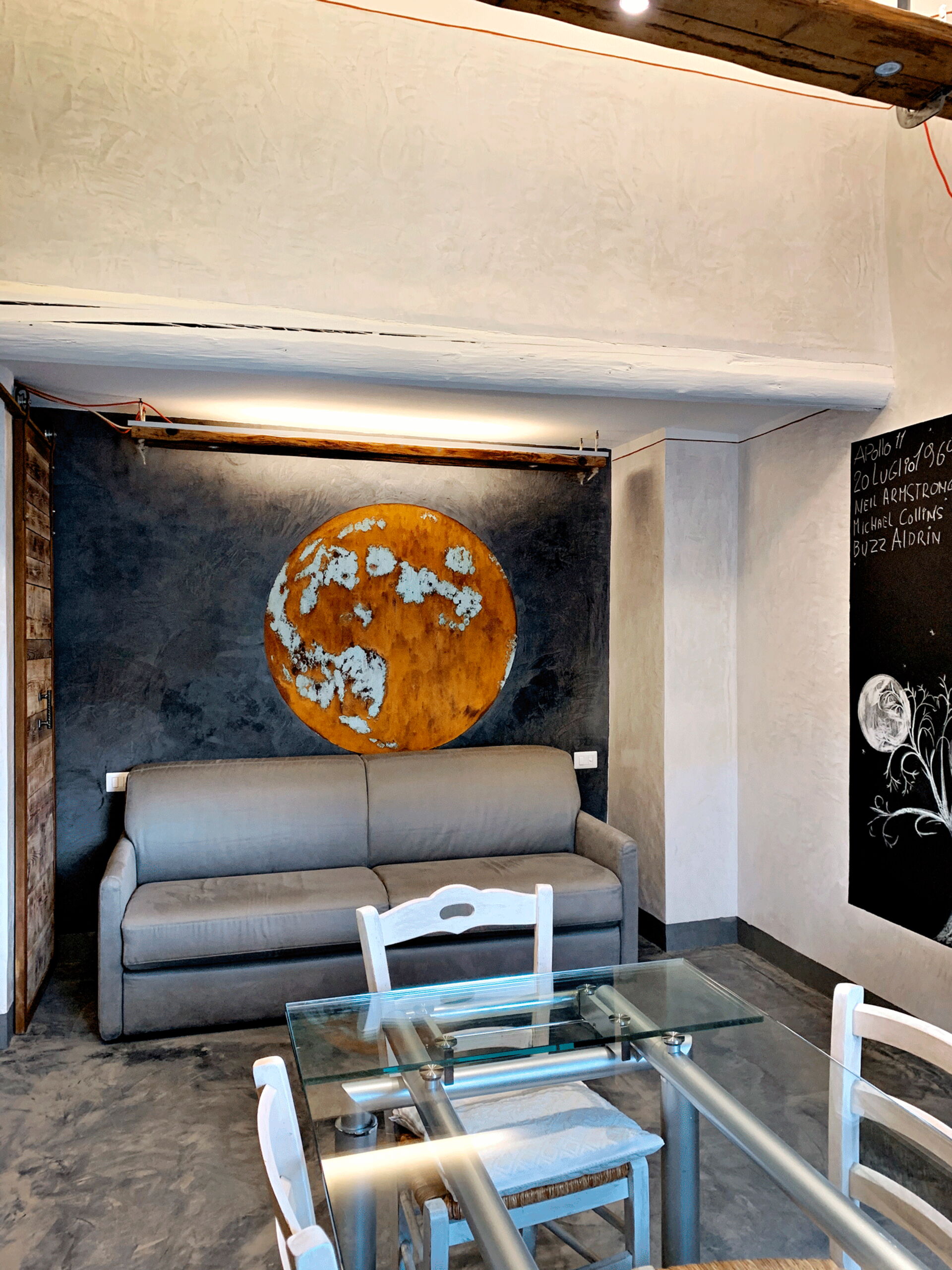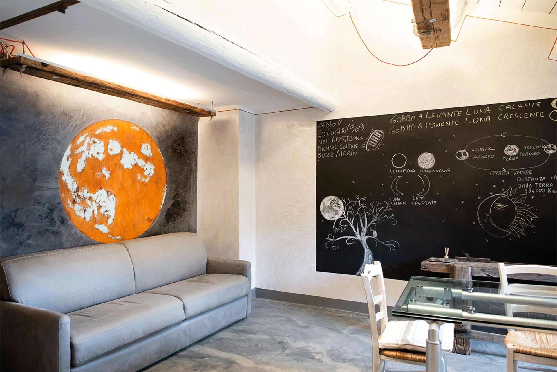 At the entrance there is the well-equipped kitchen, with a breakfast bar table and a wood-burning stove. A small hallway leads to the living area with a large table and a comfortable sofa bed. The walls are embellished with drawings depicting the moon in its various phases, and the bathroom surfaces also resemble those of the moon.