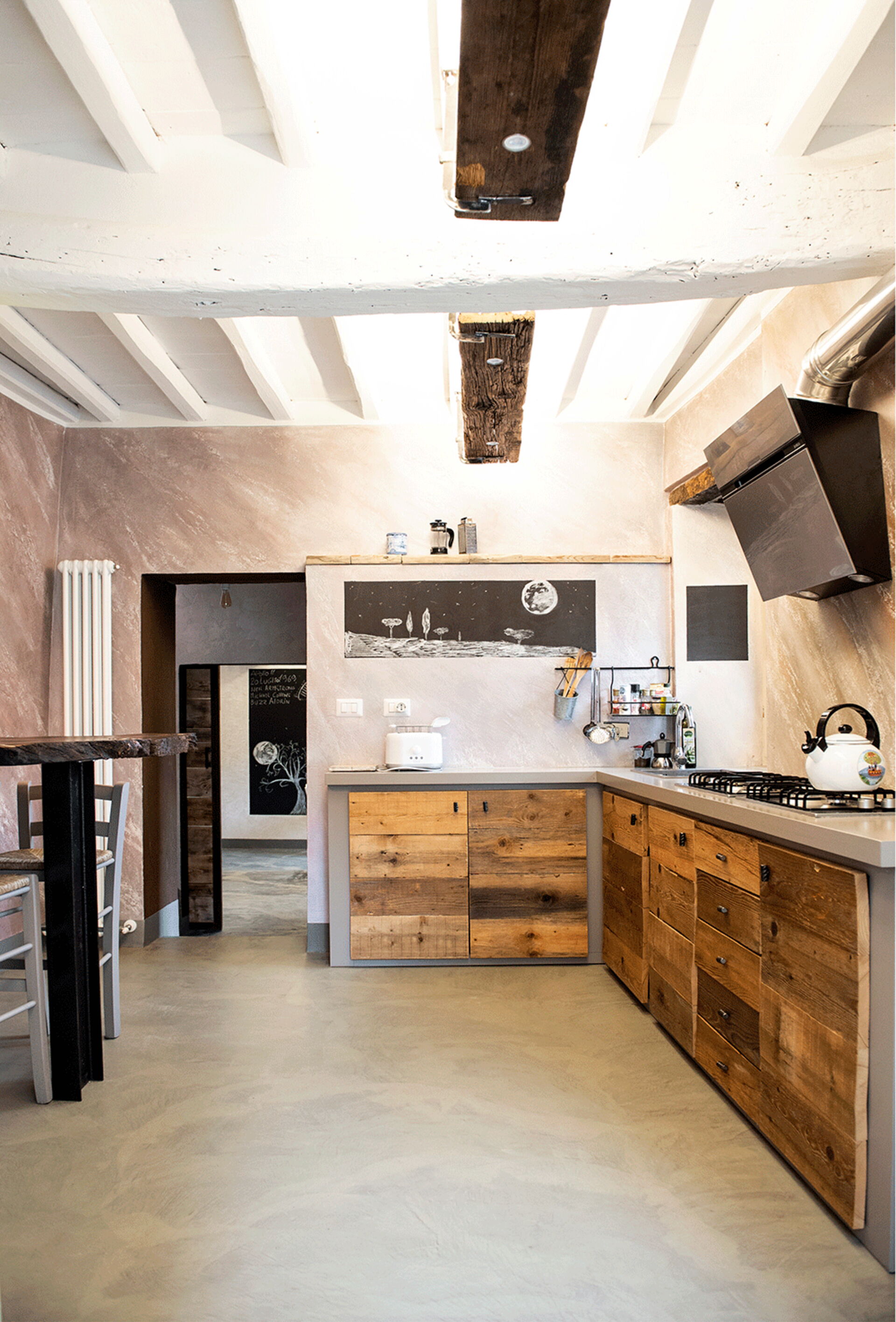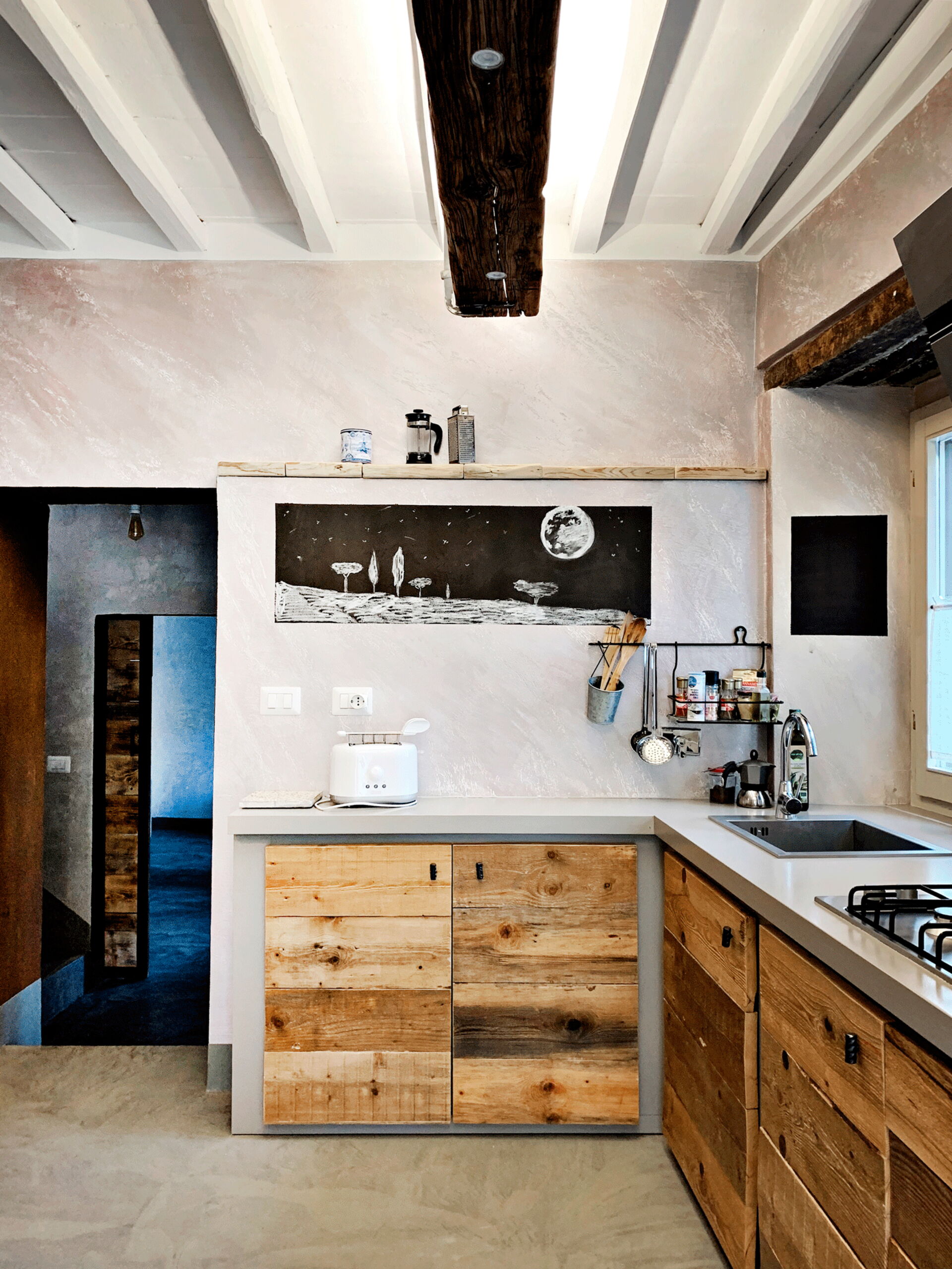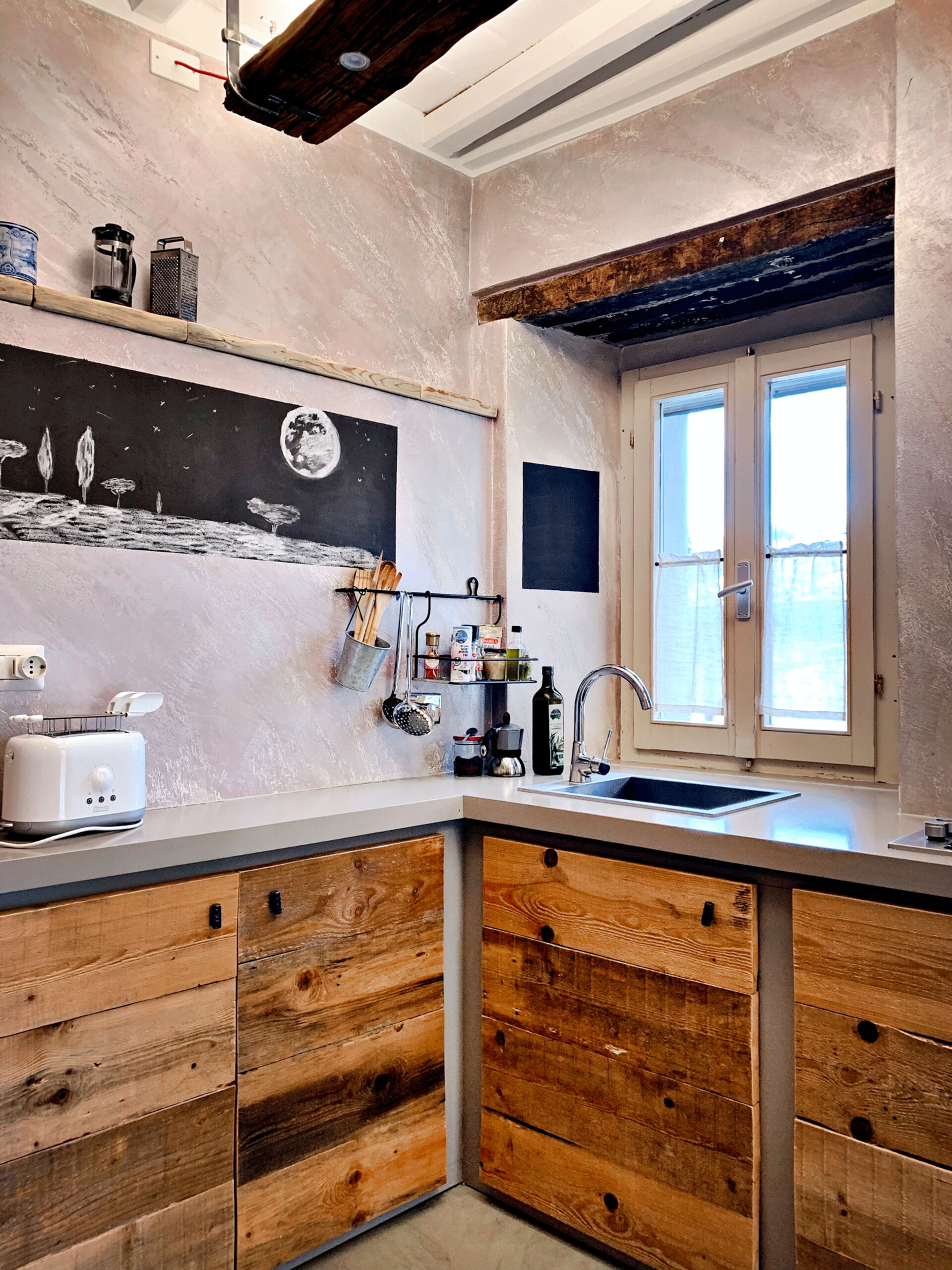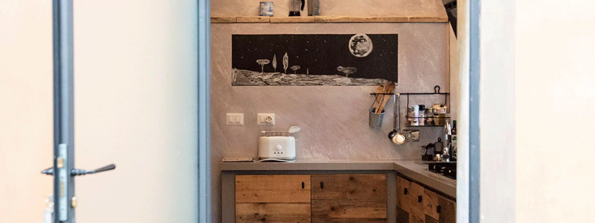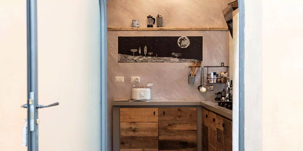 At the entrance there is the well-equipped kitchen, with a breakfast bar table and a wood-burning stove. A small hallway leads to the living area with a large table and a comfortable sofa bed. The walls are embellished with drawings depicting the moon in its various phases, and the bathroom surfaces also resemble those of the moon.