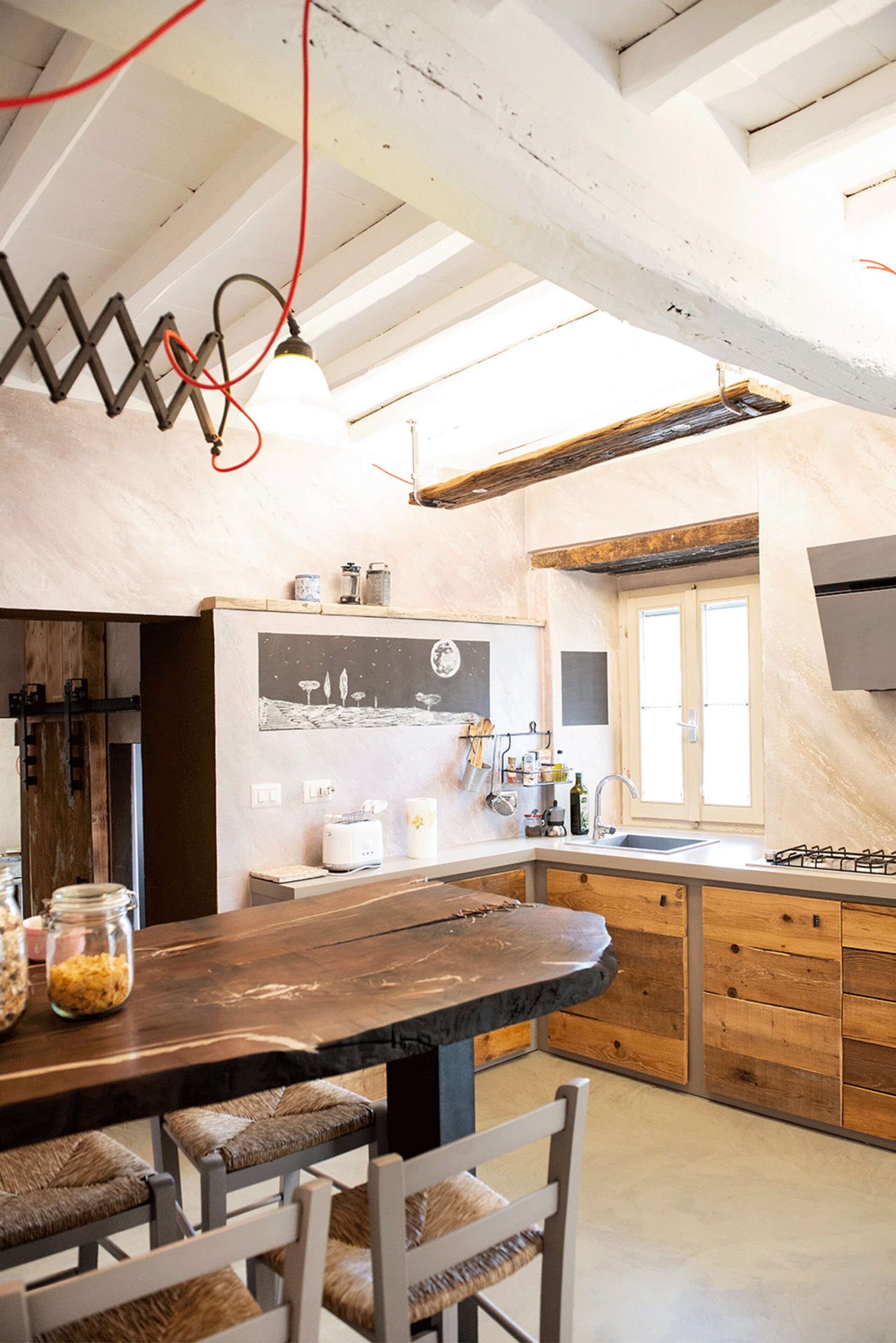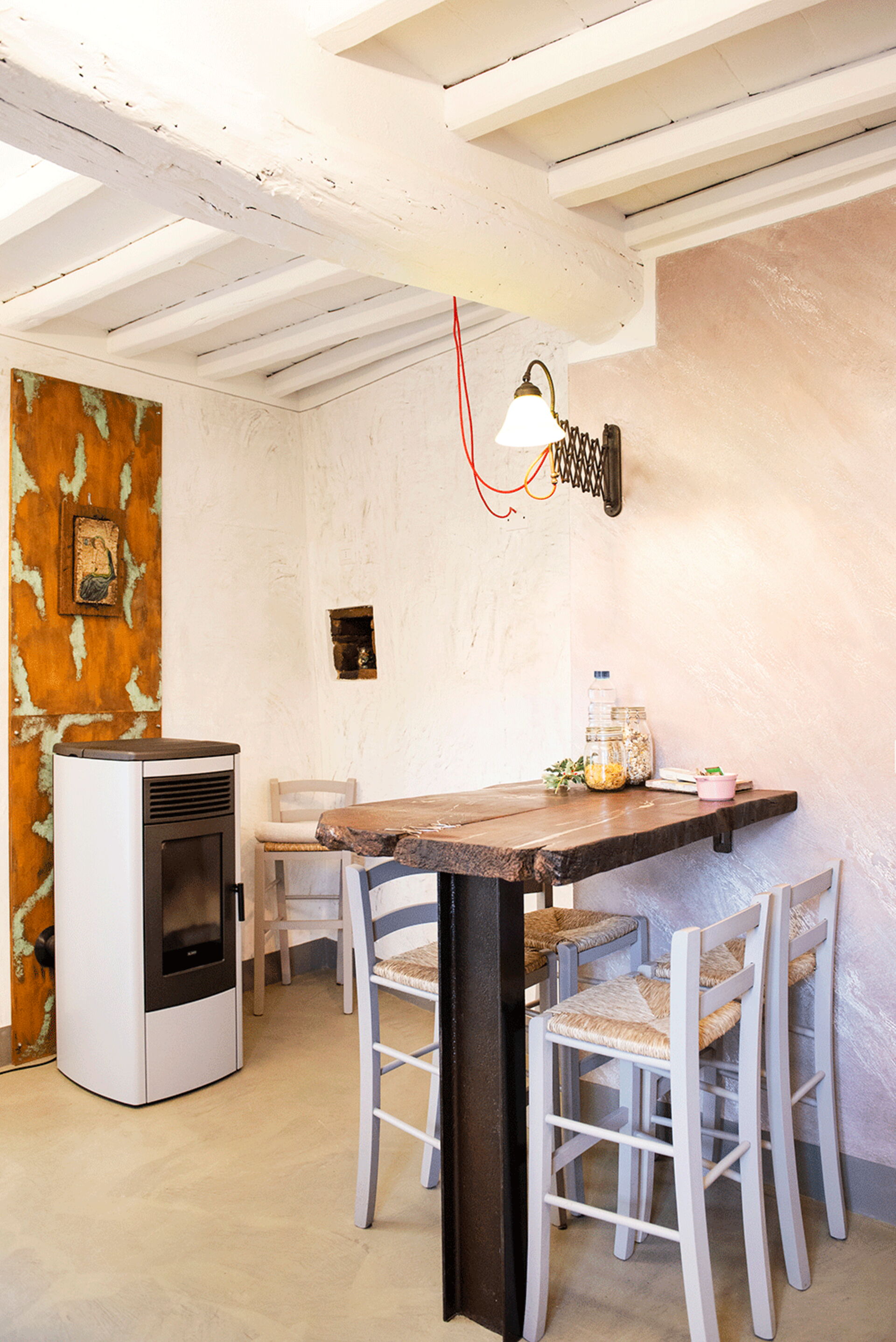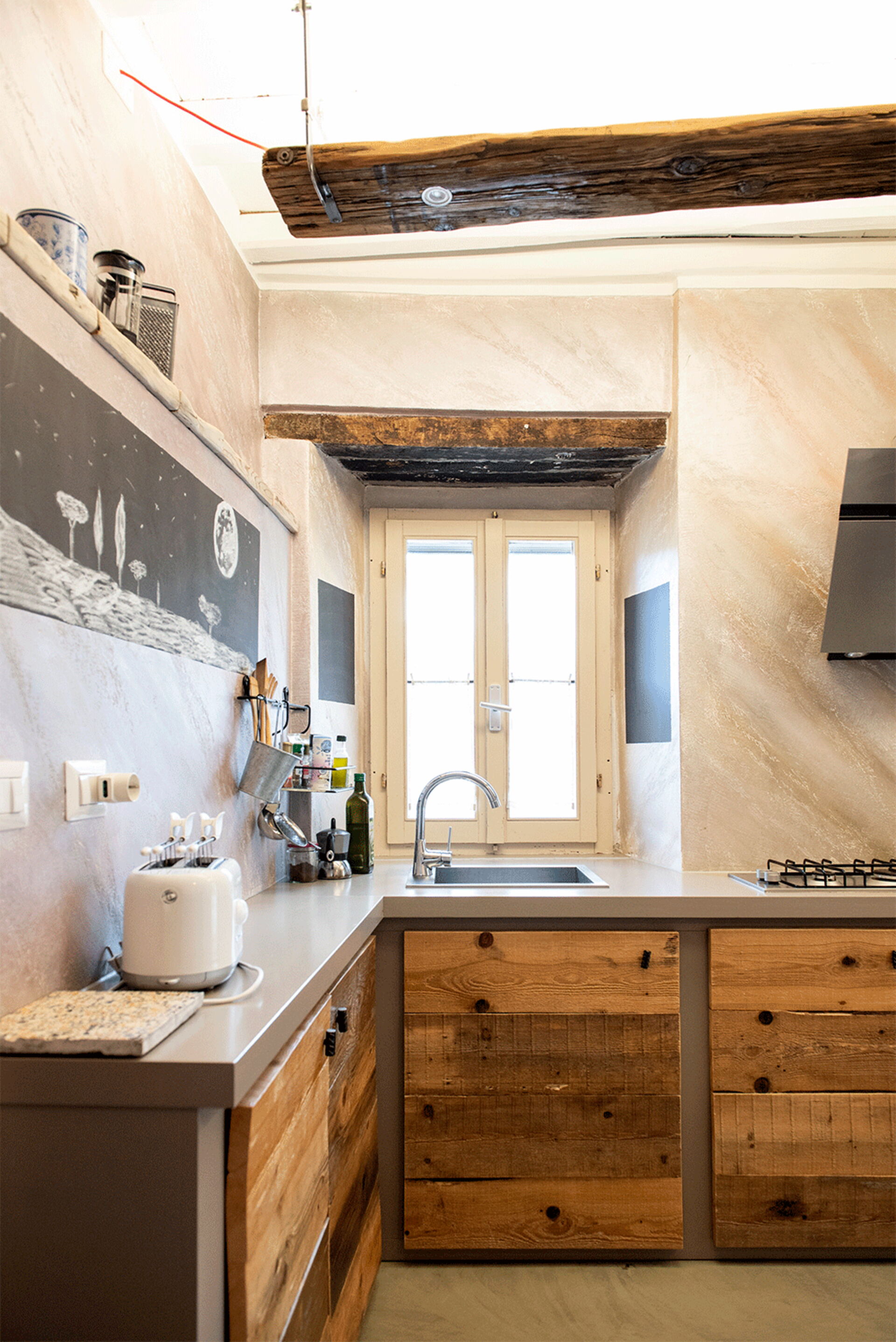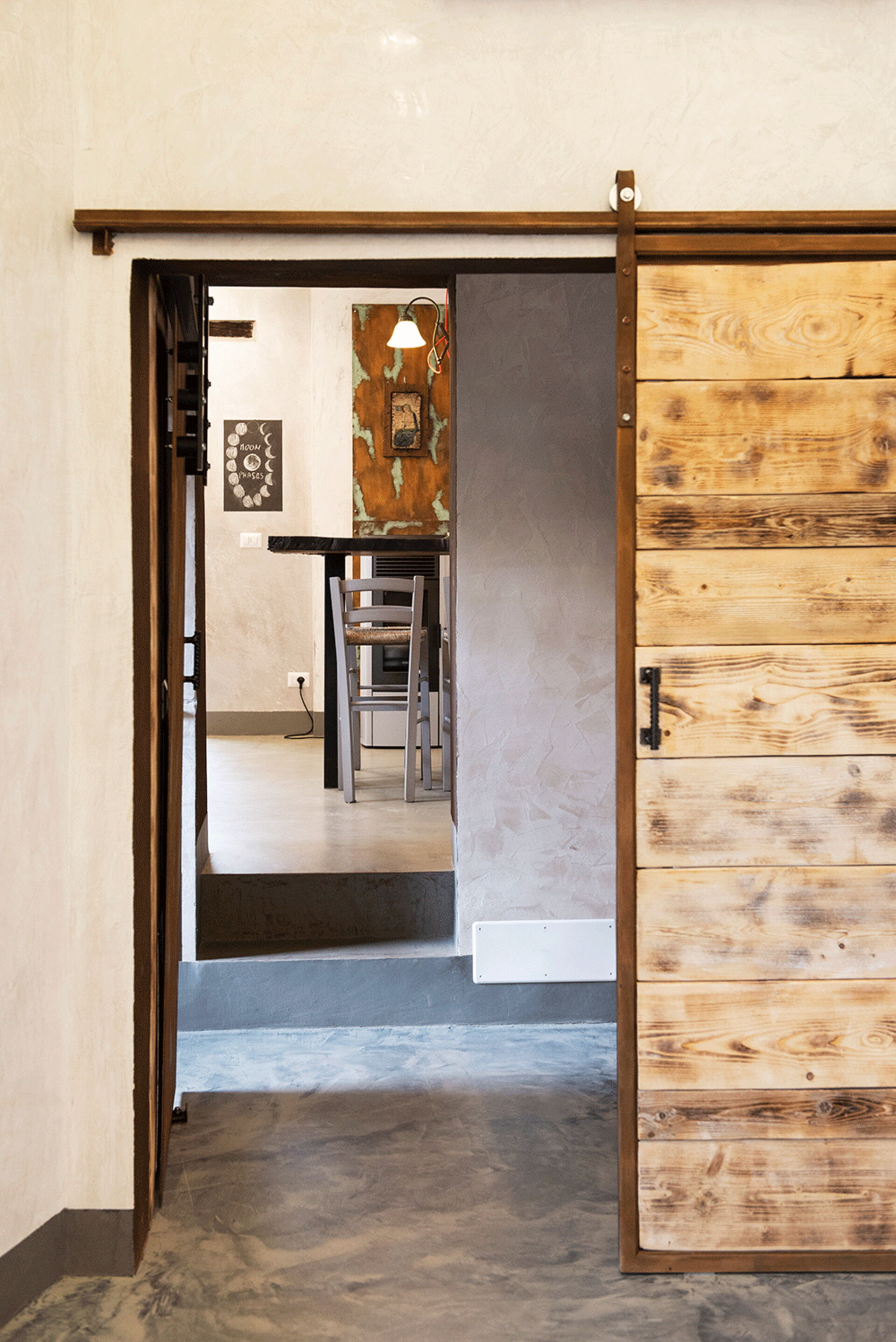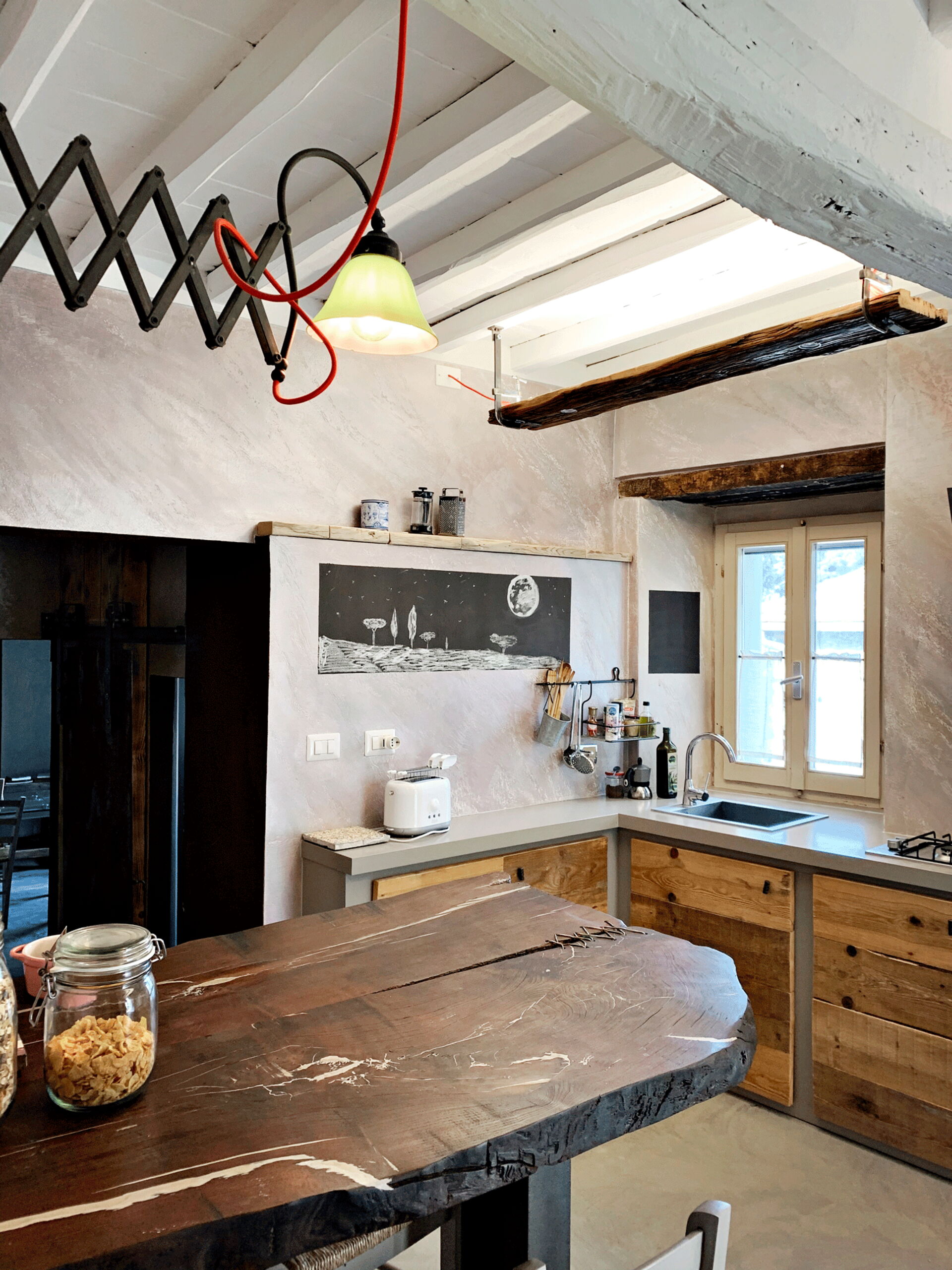 At the entrance there is the well-equipped kitchen, with a breakfast bar table and a wood-burning stove. A small hallway leads to the living area with a large table and a comfortable sofa bed. The walls are embellished with drawings depicting the moon in its various phases, and the bathroom surfaces also resemble those of the moon.