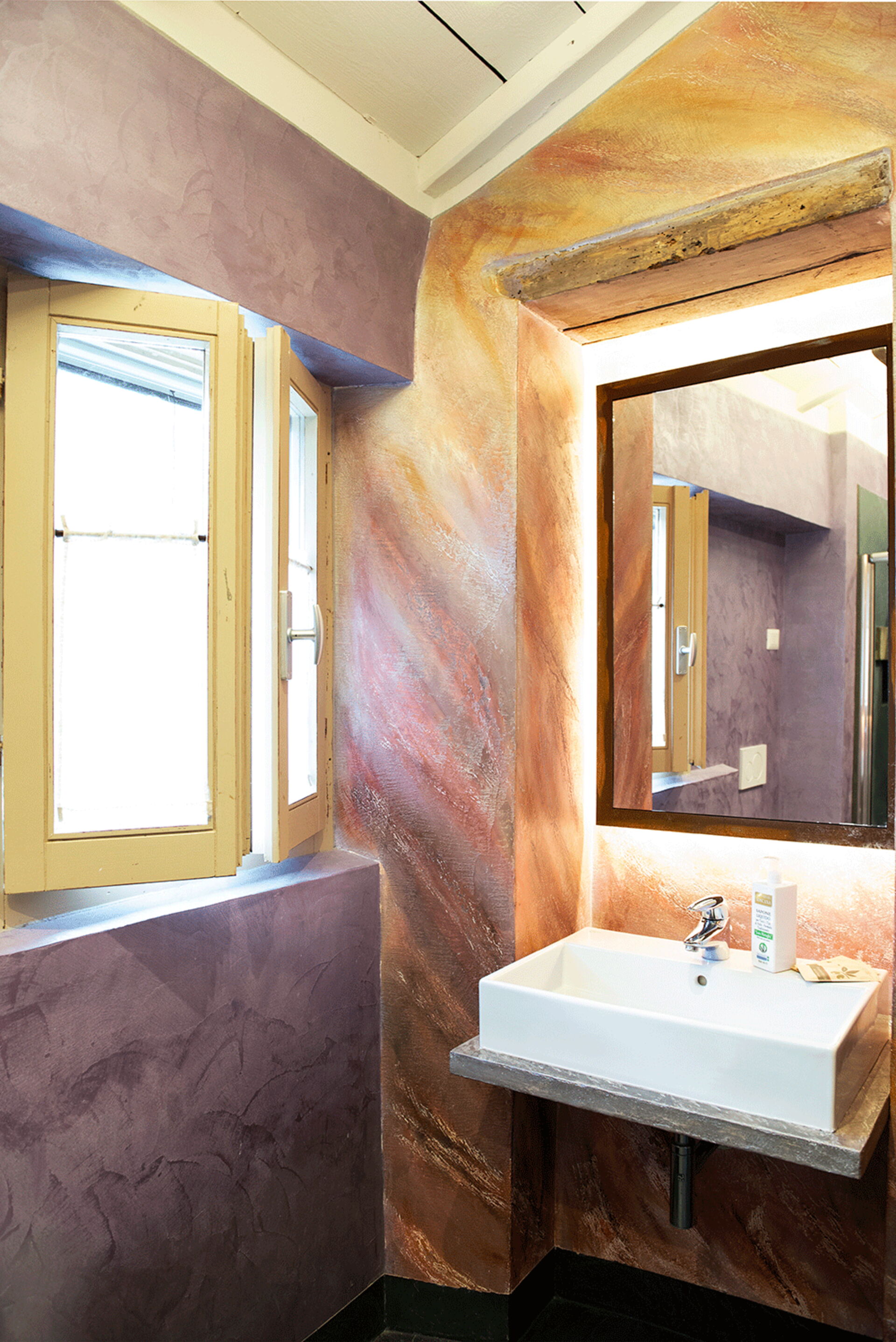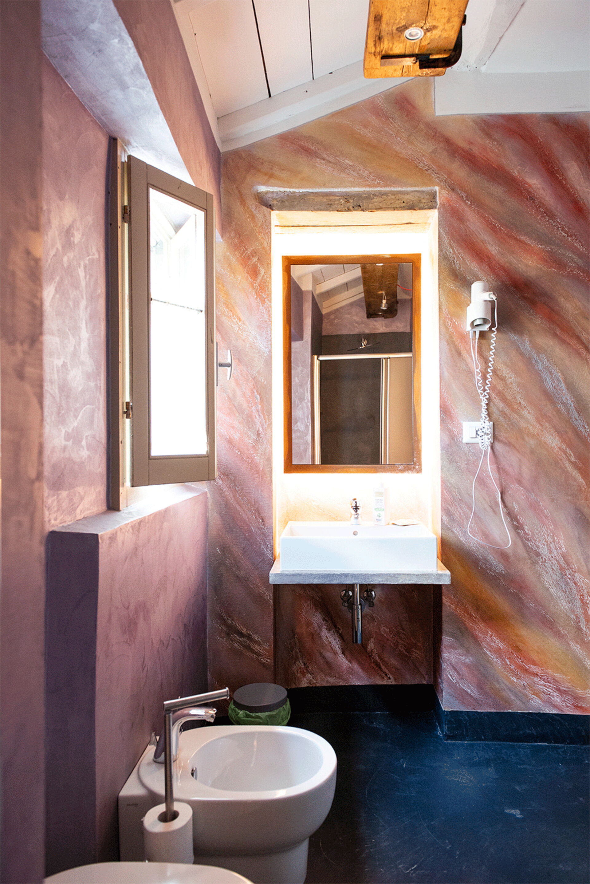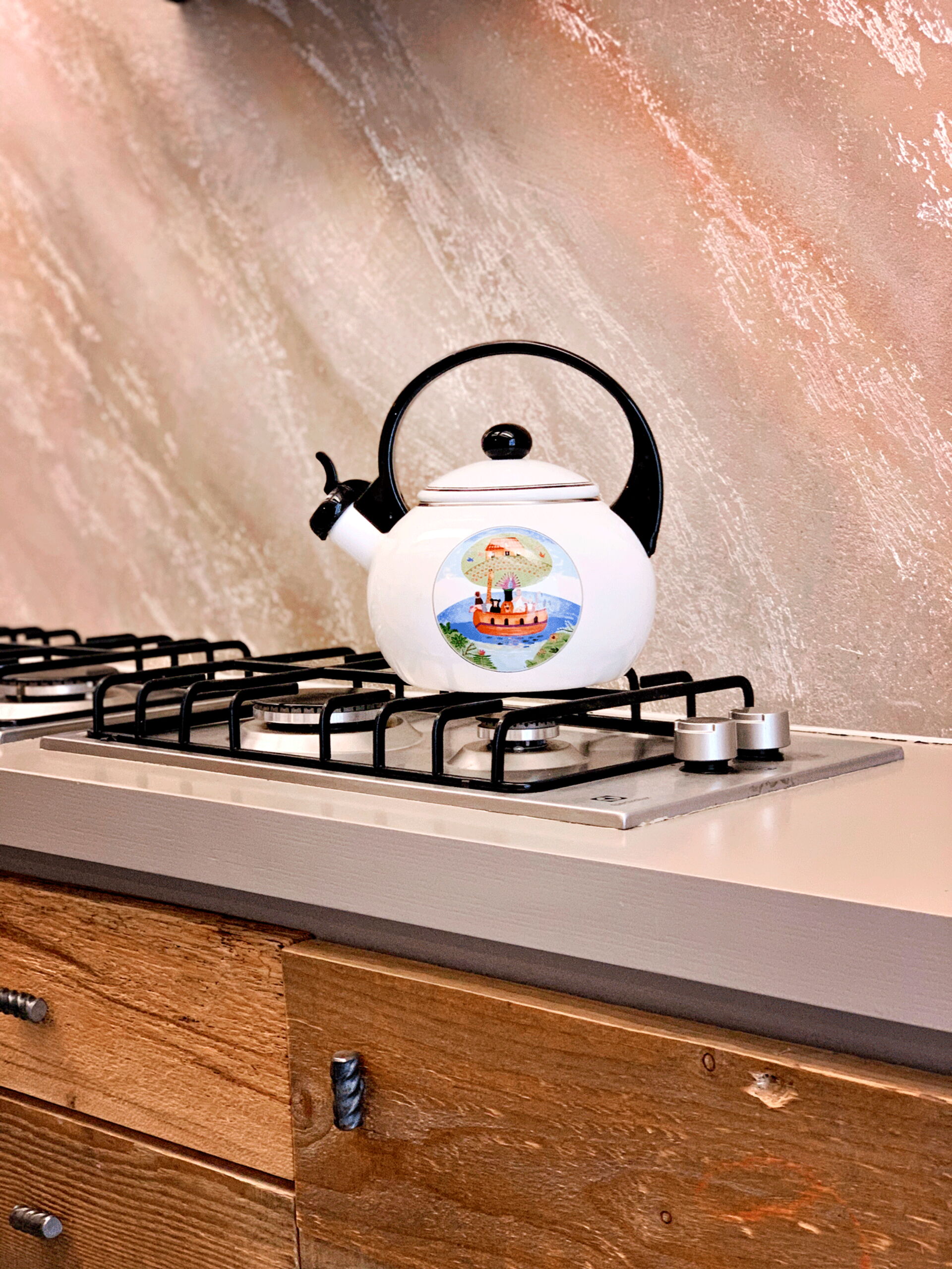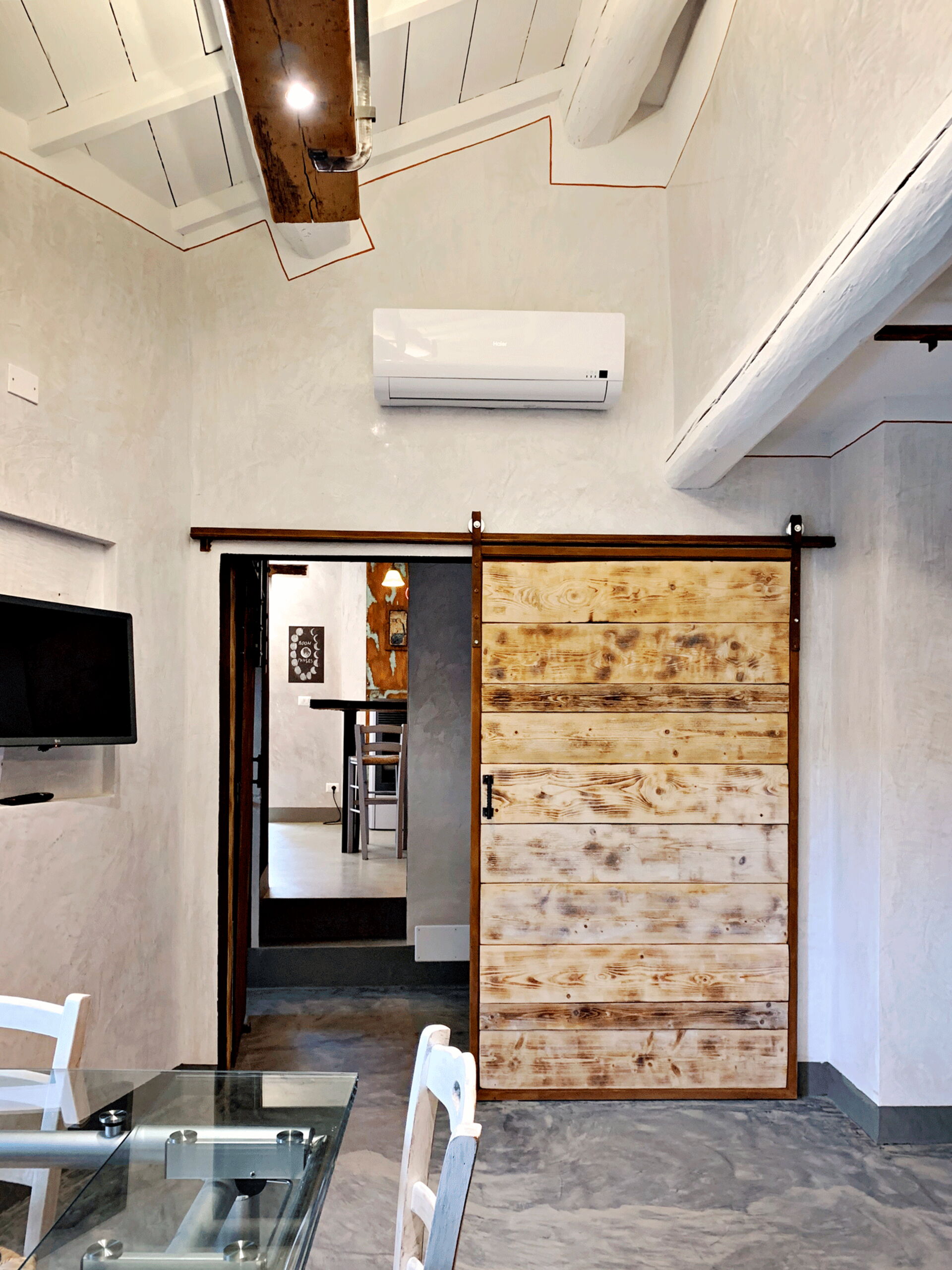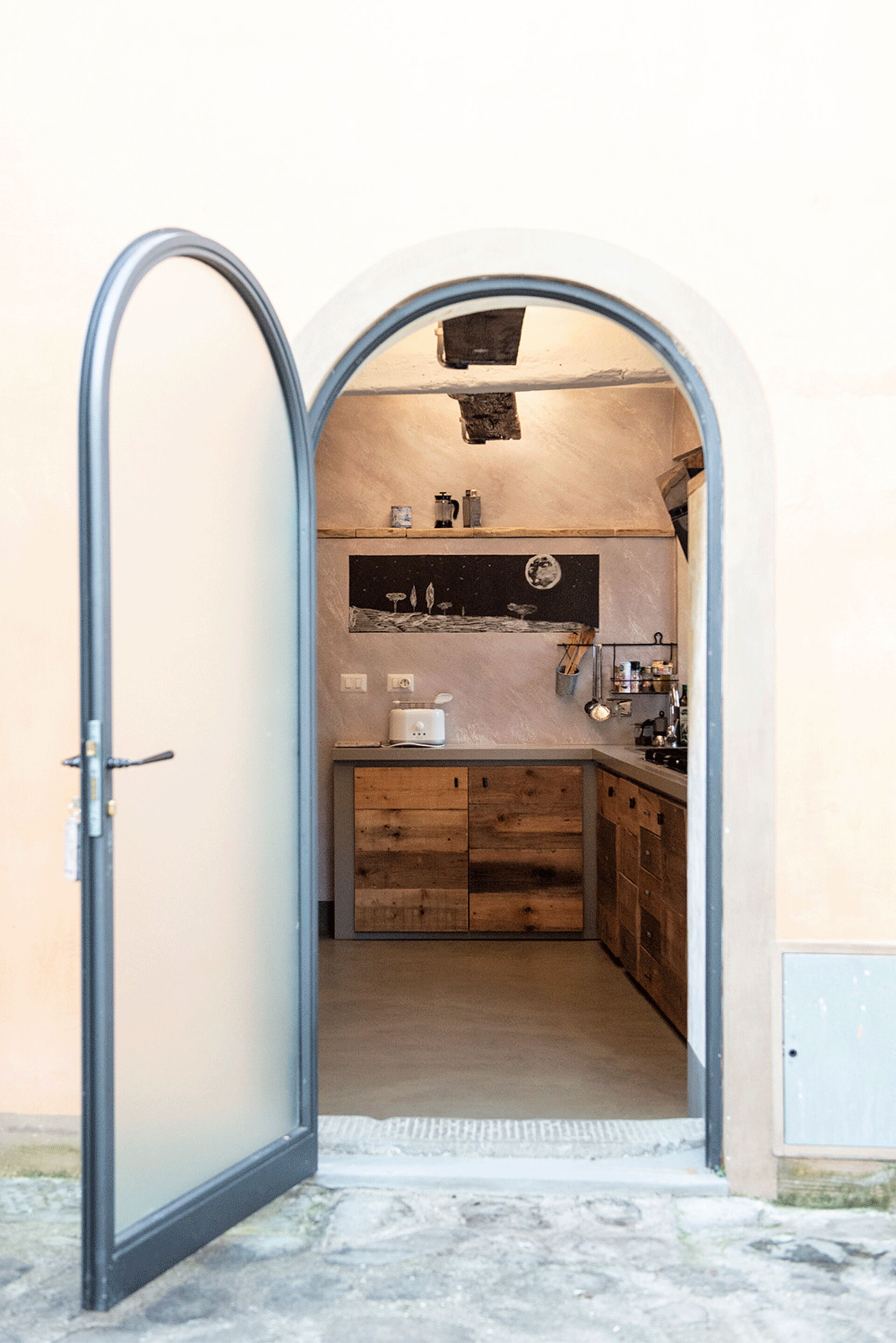 At the entrance there is the well-equipped kitchen, with a breakfast bar table and a wood-burning stove. A small hallway leads to the living area with a large table and a comfortable sofa bed. The walls are embellished with drawings depicting the moon in its various phases, and the bathroom surfaces also resemble those of the moon.