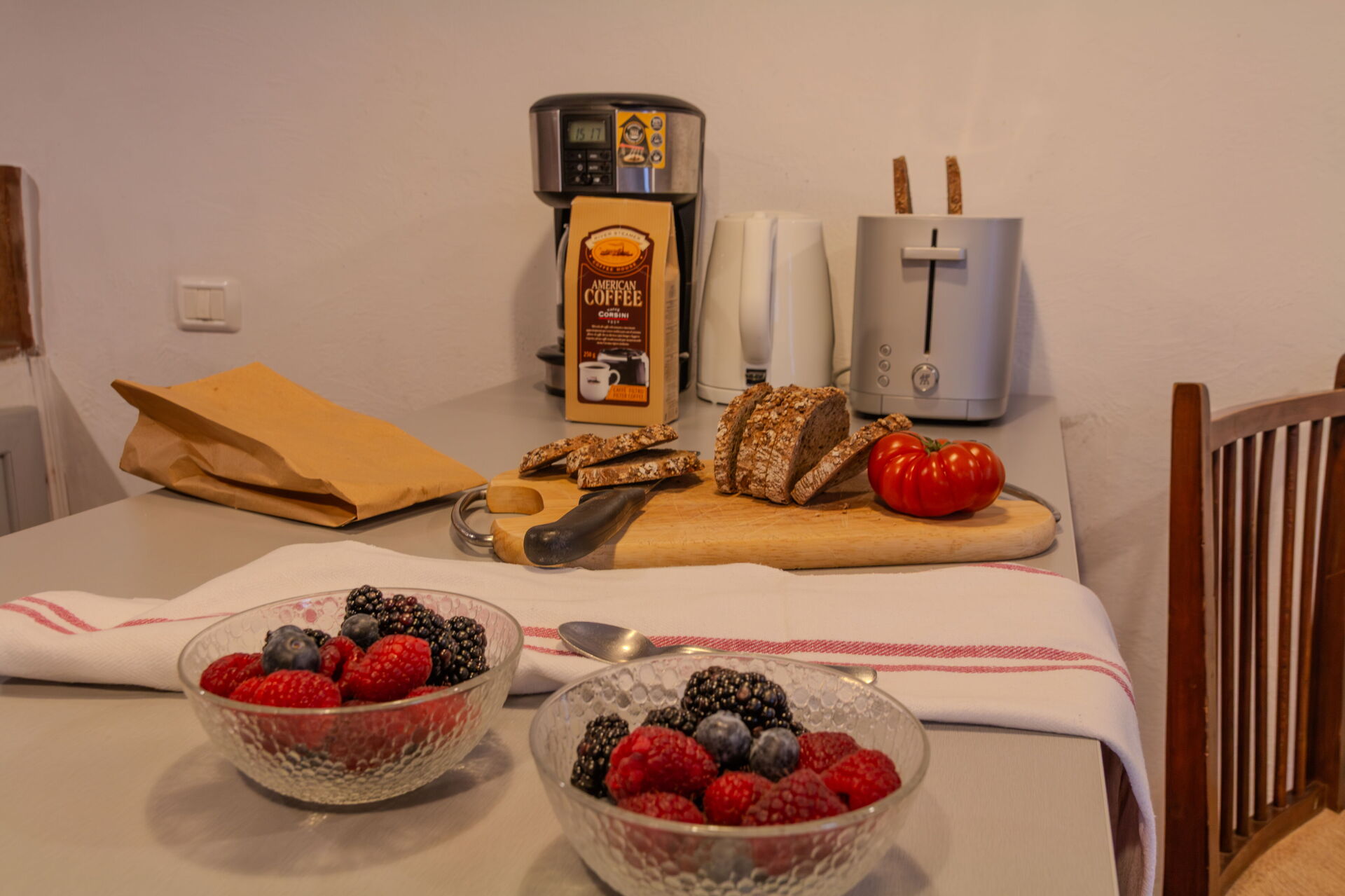 L'entrée de la maison donne sur la cuisine-séjour équipée d'un réfrigérateur, d'un micro-ondes avec grill, four, de plaques de cuisson, d'un grille-pain, d'une machine à café et d'une table en bois avec 4 chaises.