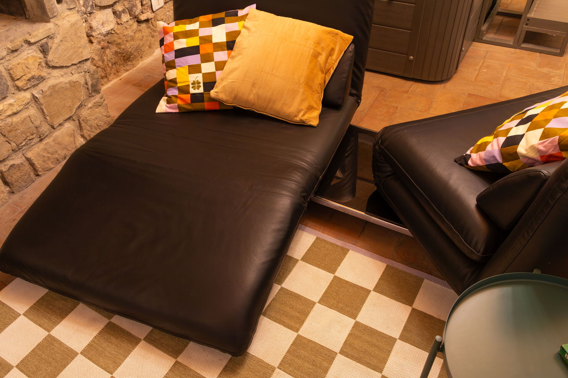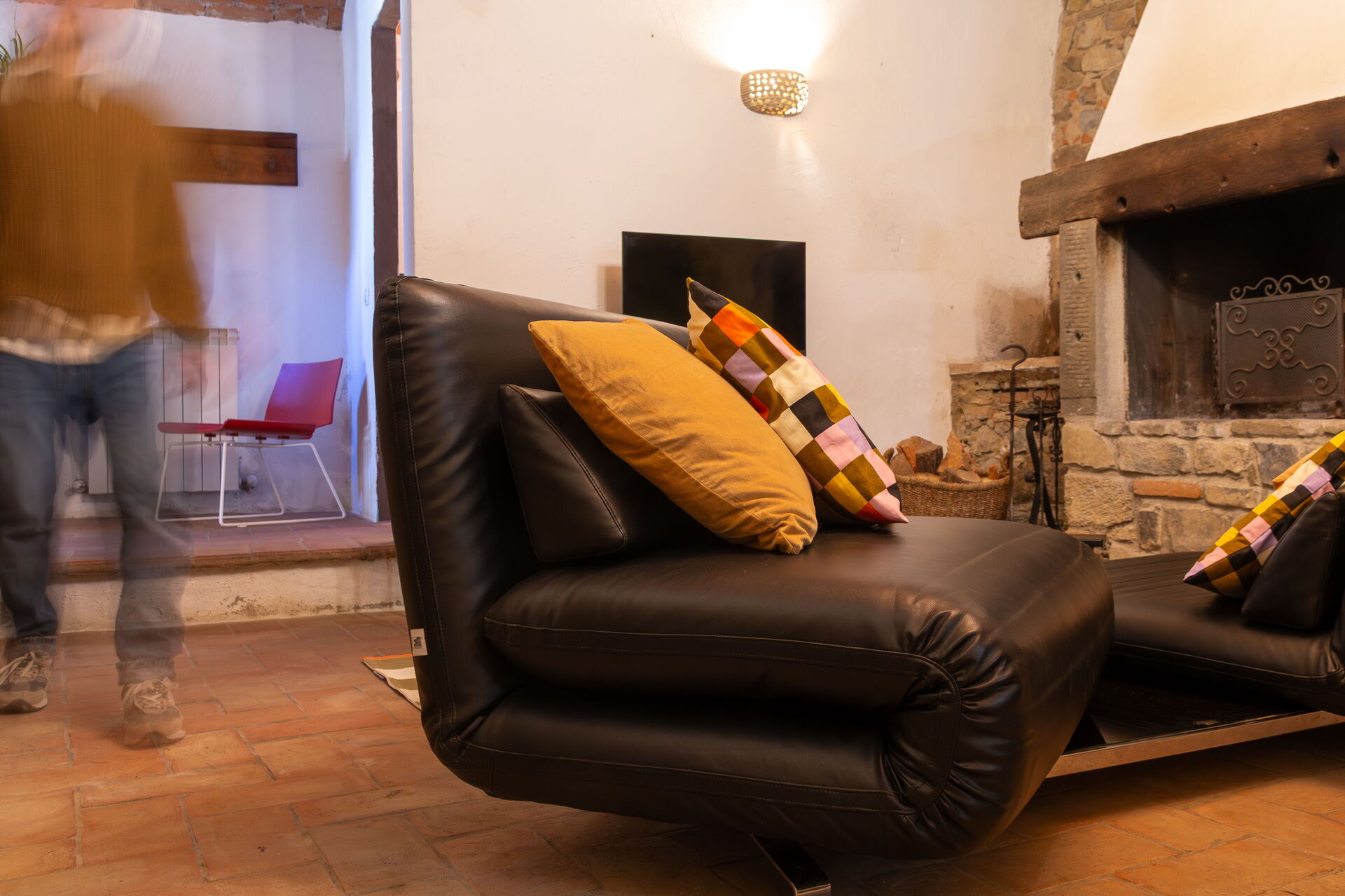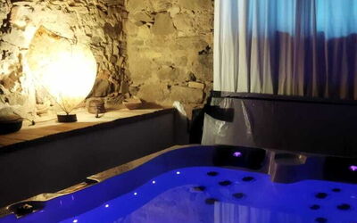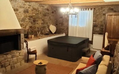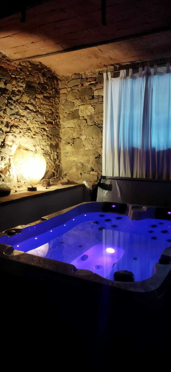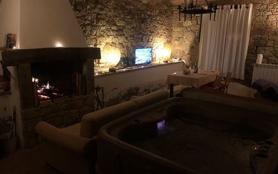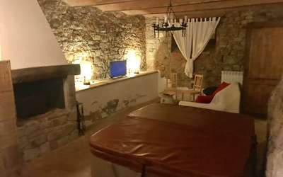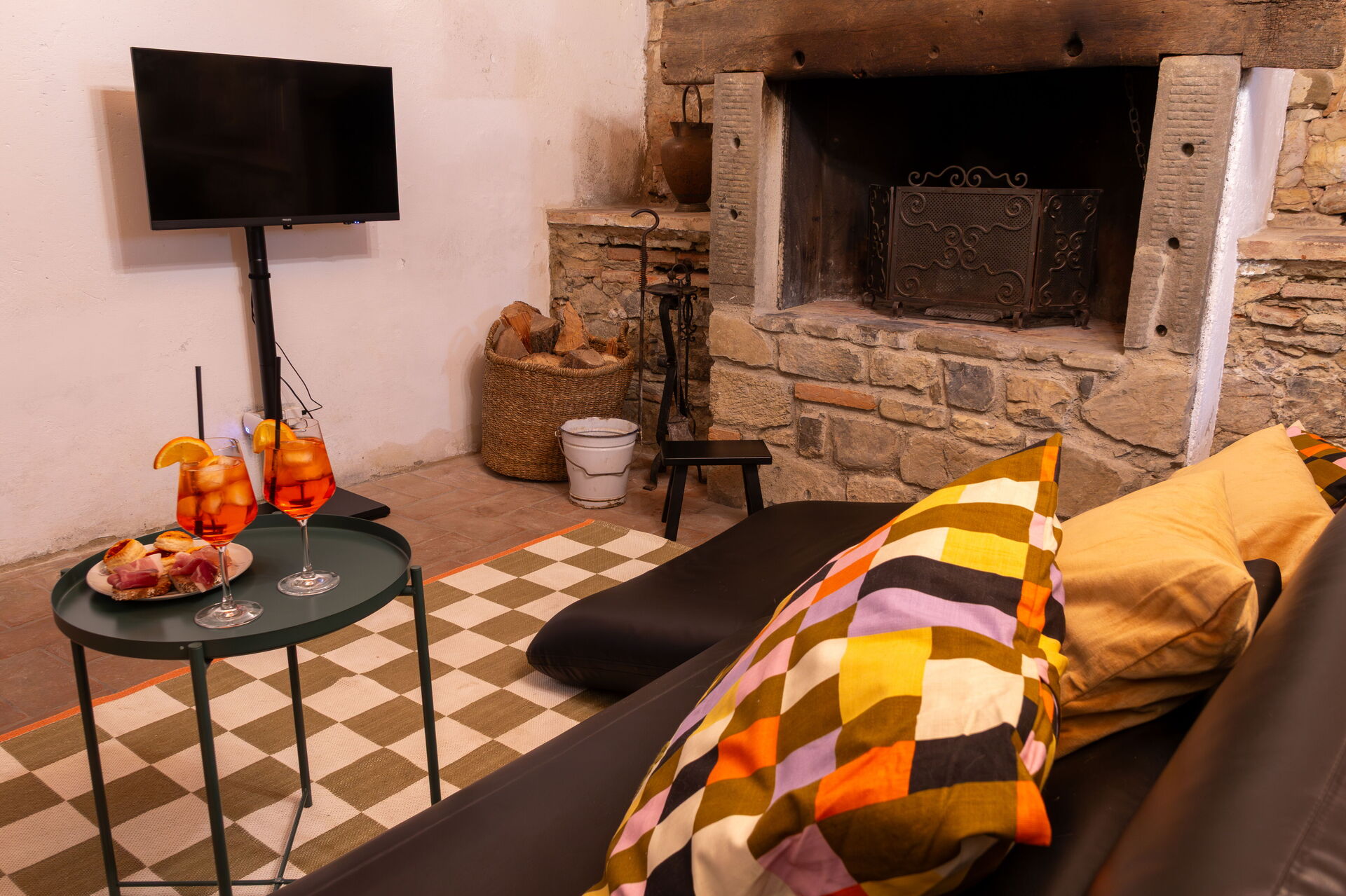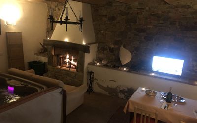 Après le coin cuisine, en passant devant la première salle de bain, vous pouvez accéder à une large pièce équipée d'une belle cheminée, et d'un jacuzzi pour 4 personnes. d'un double canapé-lit avec TV + Netflix/ Amazon Video.