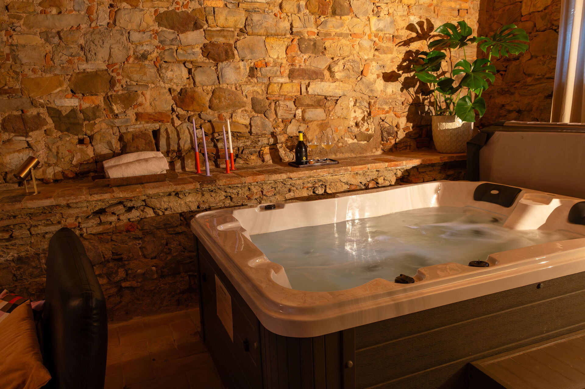 La Miccia (60m2, capacité de 2+2 personnes, une chambre, un canapé-lit, 2 salles de bains). Cuisine bien équipée et séjour, grande pièce avec cheminée, canapé-lit, jacuzzi, TV+Netflix/ Amazon Video. Chambre avec lit baldaquin et salle de bain privée. Les deux salles de bains sont avec cabine de douche.