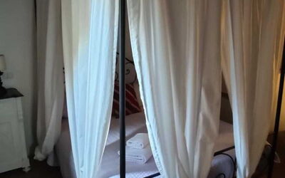 A côté de la pièce au jacuzzi se trouve une porte menant à une chambre avec lit à baldaquin 2 places, dont le charme est accentué par les meubles attenants datant du 19ème siècle et appartenant à la famille. La chambre est éclairée par une large fenêtre. Au fond de la chambre se trouve la deuxième salle de bain avec douche et sèche-cheveux.