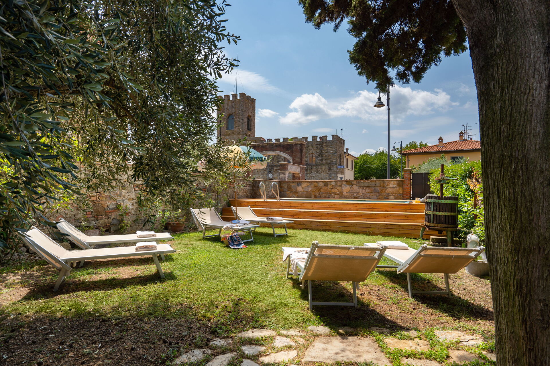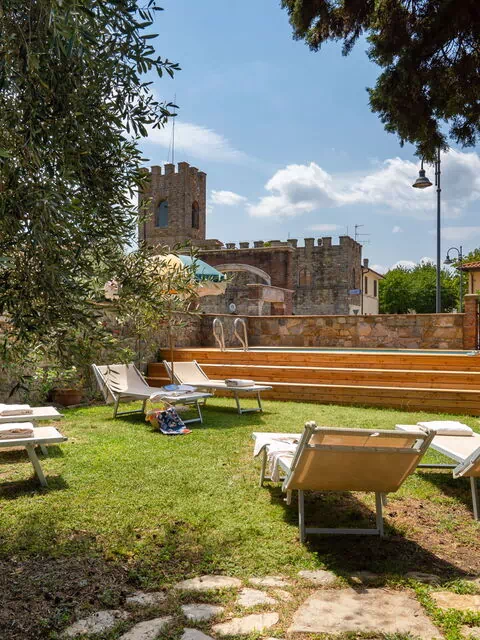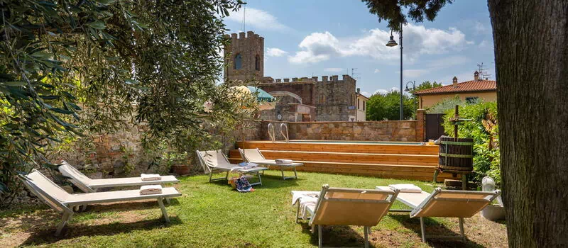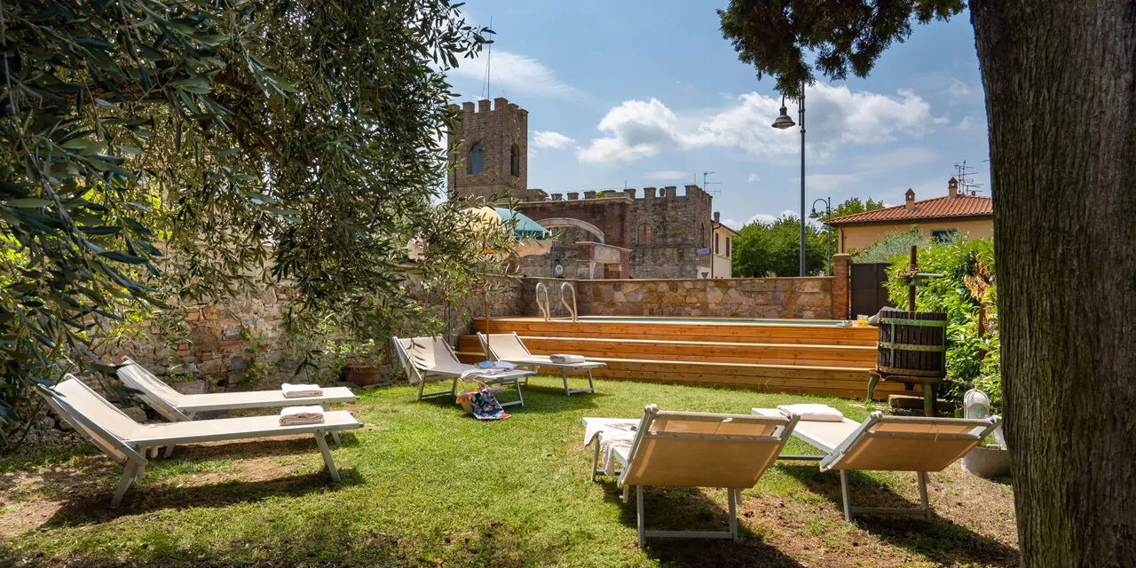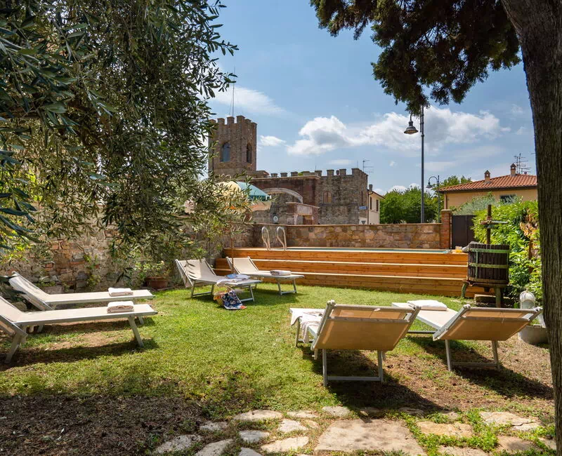 Le jardin est délicatement décoré de fleurs et d'arbres fruitiers. Il possède une piscine au fond entourée de chaises et de lits de jardin pour profiter à fond du soleil de toscane.