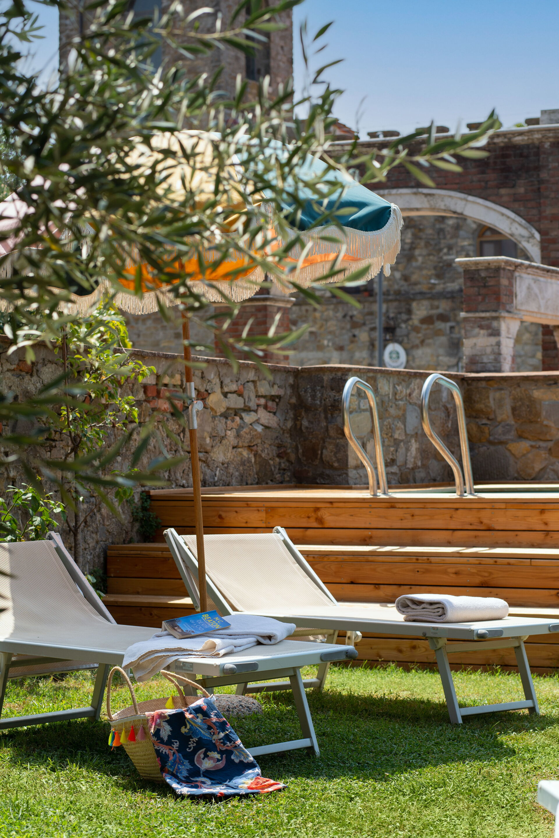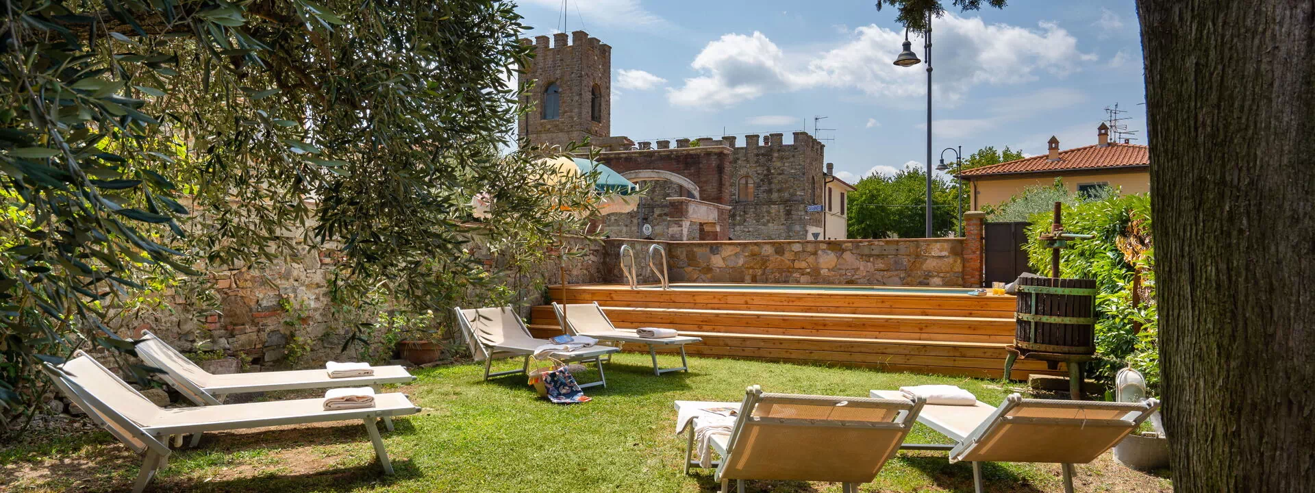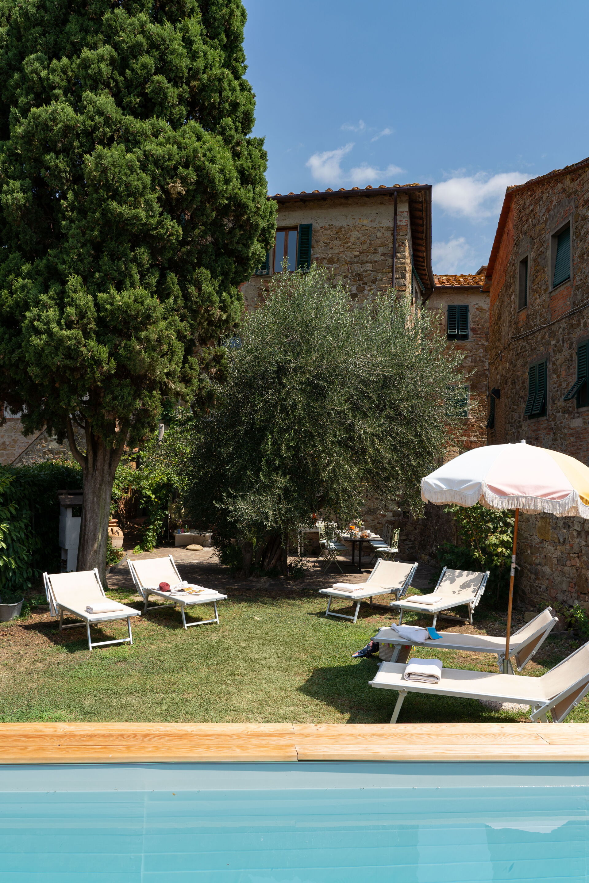 Le jardin est délicatement décoré de fleurs et d'arbres fruitiers. Il possède une piscine au fond entourée de chaises et de lits de jardin pour profiter à fond du soleil de toscane.