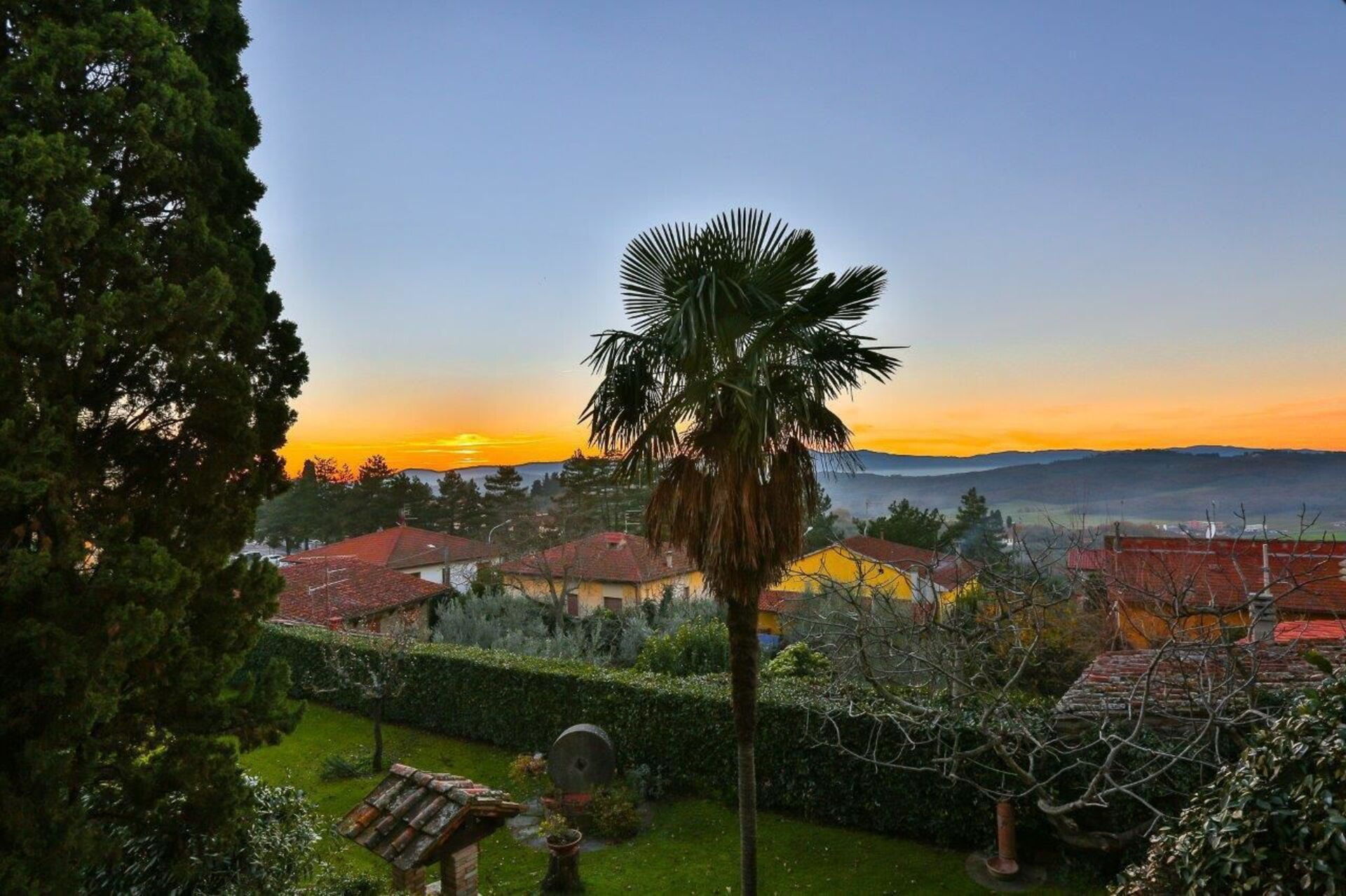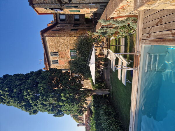De la cuisine, une porte vous mène dehors. Le jardin est délicatement décoré de fleurs et d'arbres fruitiers. Il possède une piscine au fond entourée de chaises et de lits de jardin pour profiter à fond du soleil de toscane.