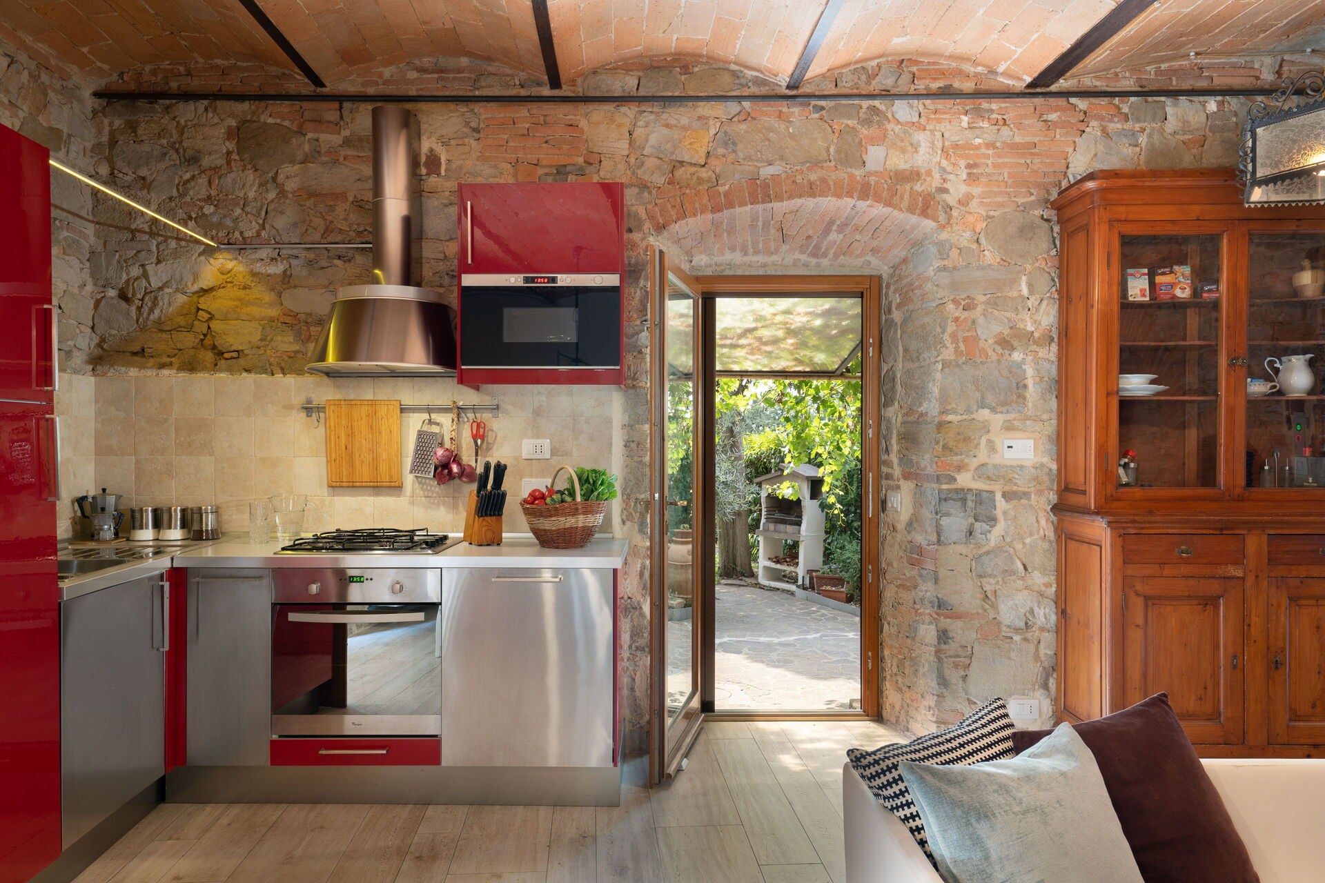 The sitting room is spacious. Very characteristic with stone walls and bricks arches.