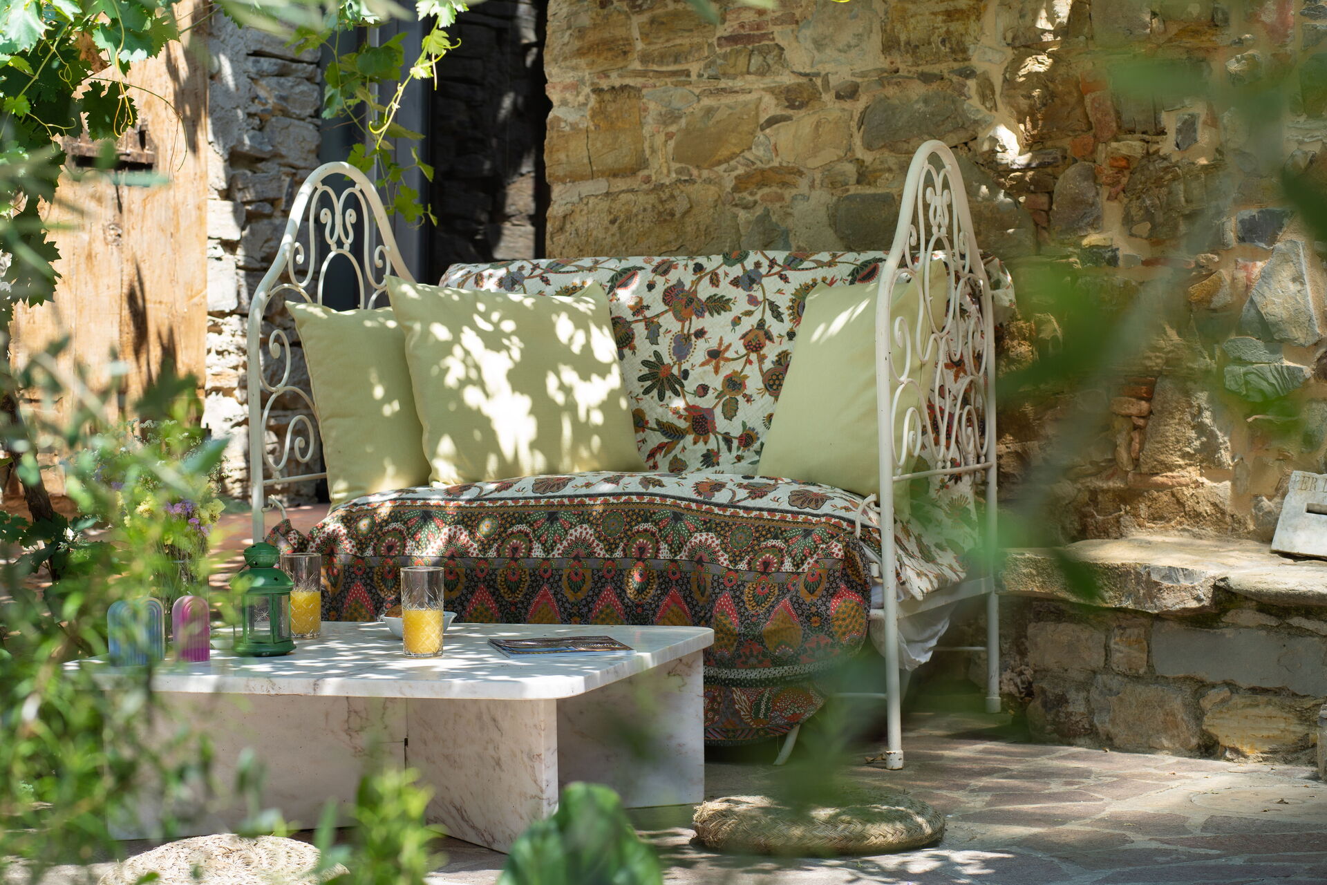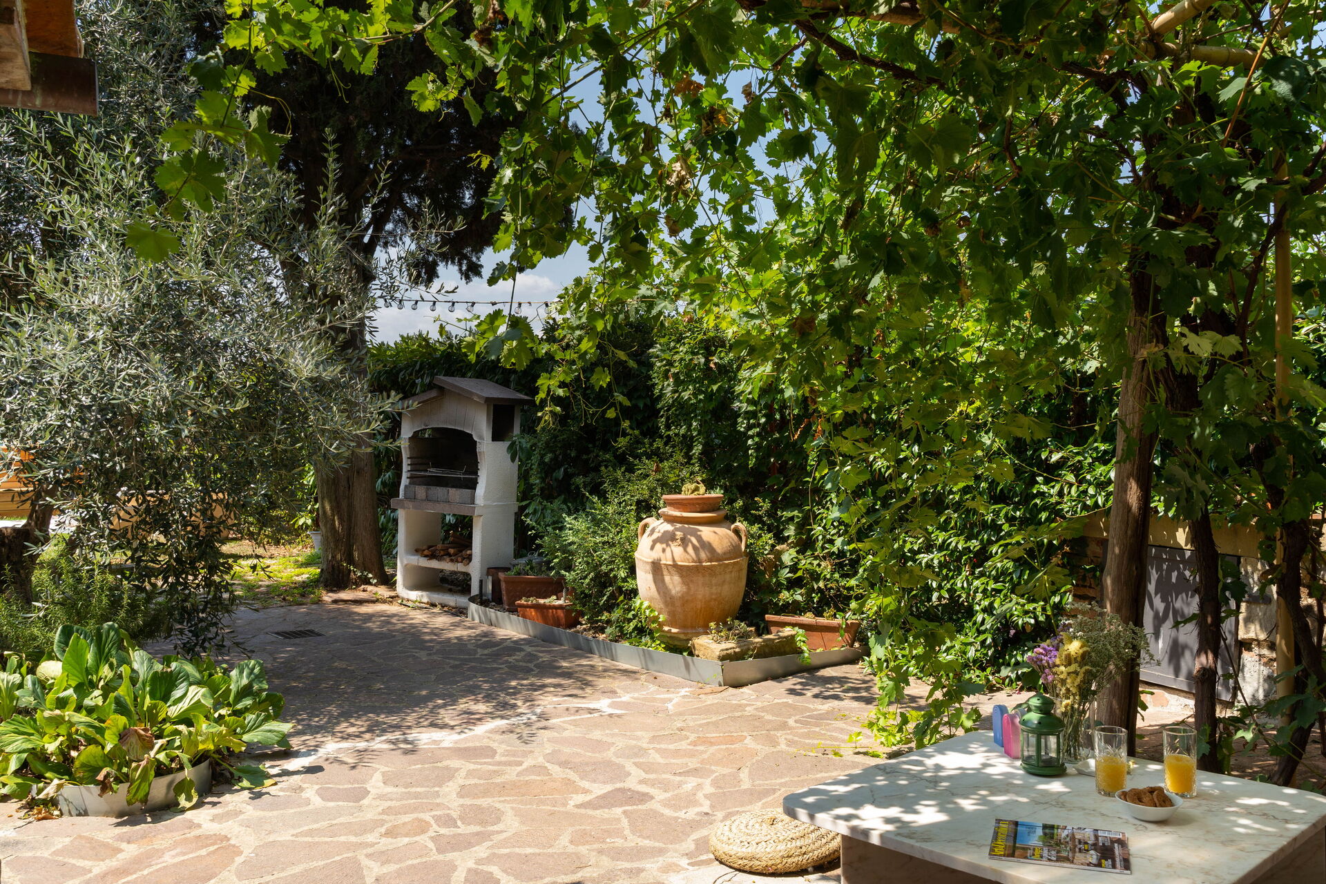 Derrière la maison se trouve un jardin privé. Juste après la porte, dehors, se trouve un jolie patio couvert de vignes avec une table et des chaises pour que nos invités puissent déjeuner ou diner en plein air. Sur le côté se trouve un coin relaxant avec un élégant belvédère tenant compagnie à un bel olivier!