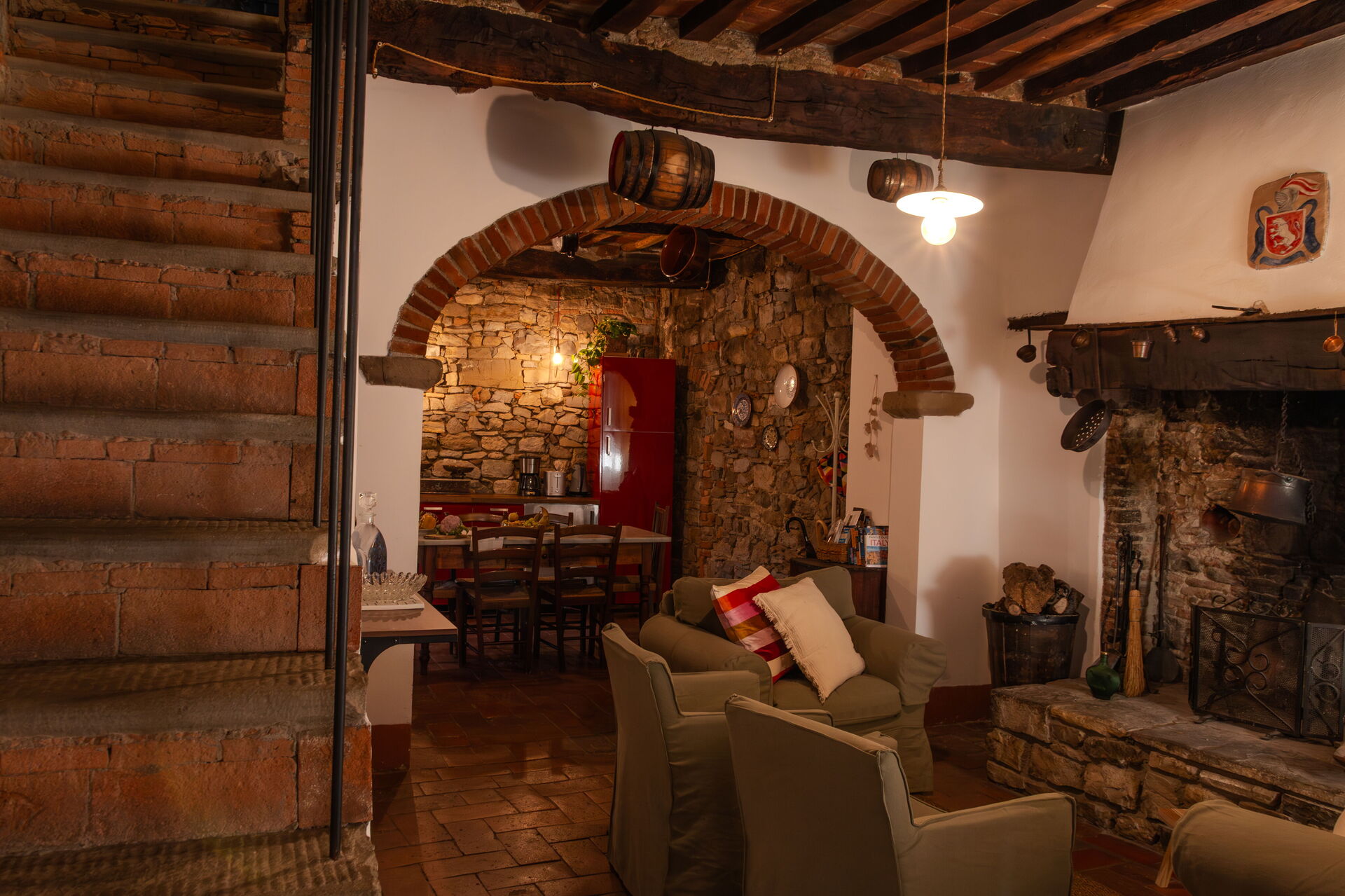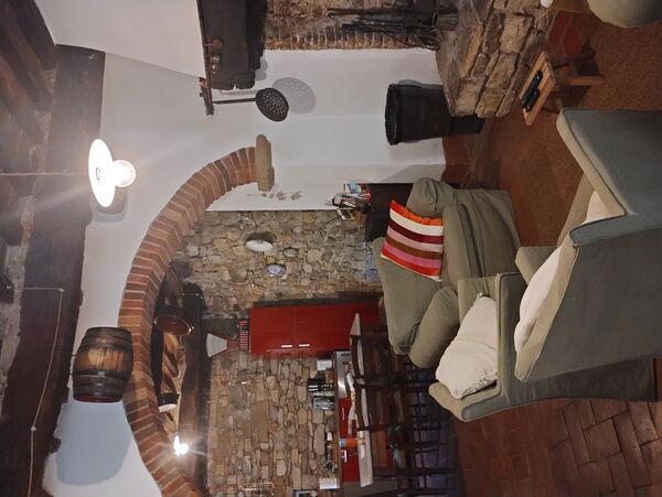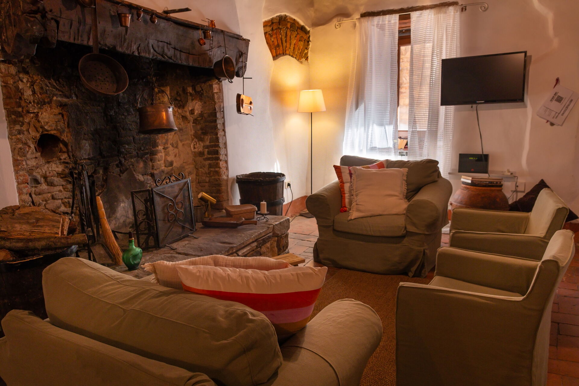 L'accogliente soggiorno ha un grande camino, due poltrone e un divano con Tv (Netflix+Amazon video), ed è connesso alla zona pranzo con un grande arco in mattoni.