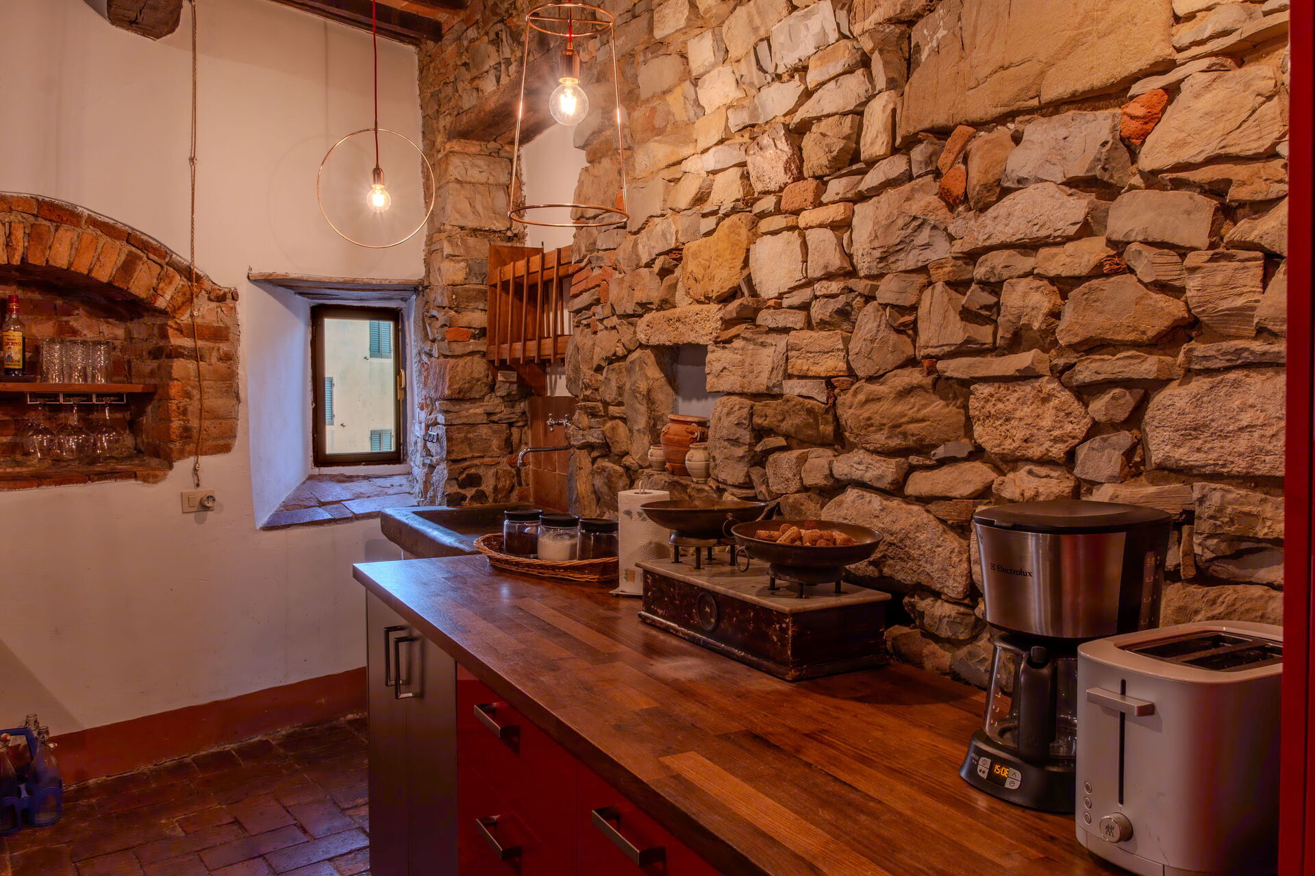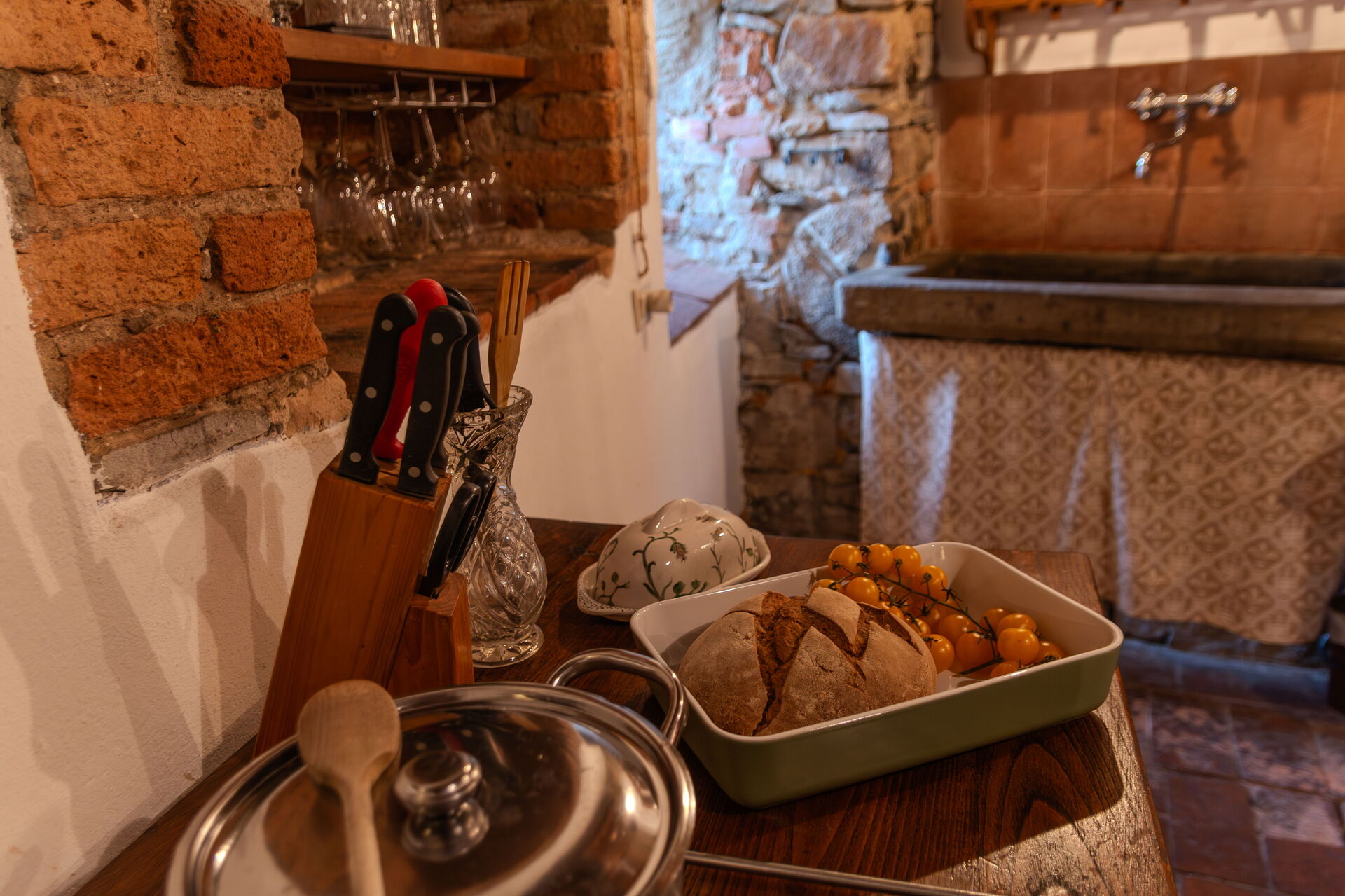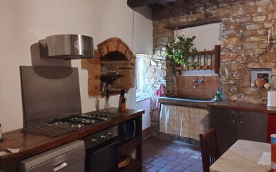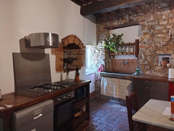 La cucina è completa di tutto , con frigo/freezer, cucina e forno, microonde,lavastoviglie ed ha un lavello antico in pietra che probabilmente risale al 16° secolo. In una piccola stanza di servizio c'è la lavatrice, il ferro e l'asse da stiro.