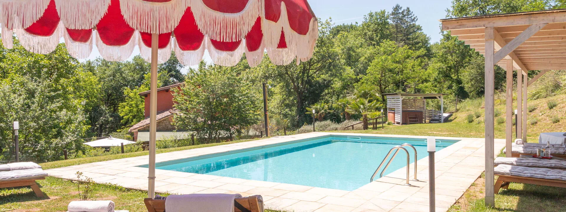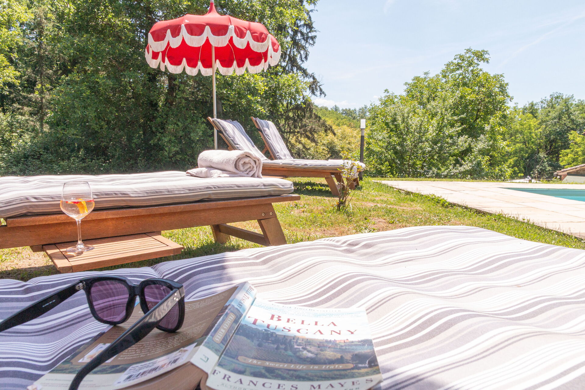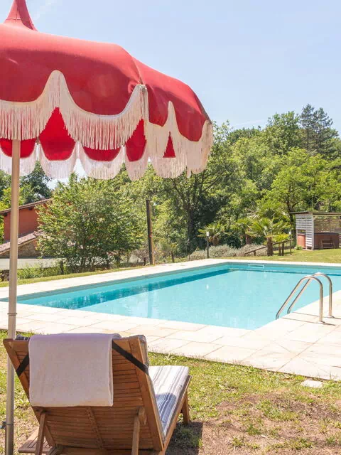 Nel grande parco a pochi passi dalla colonica, lungo il romantico torrente Il Doccio, si trova una bella e ben mantenuta piscina con lettini e tre gazebo, dove i nostri ospiti saranno accolti dall'atmosfera calma ed accogliente del verde circostante.