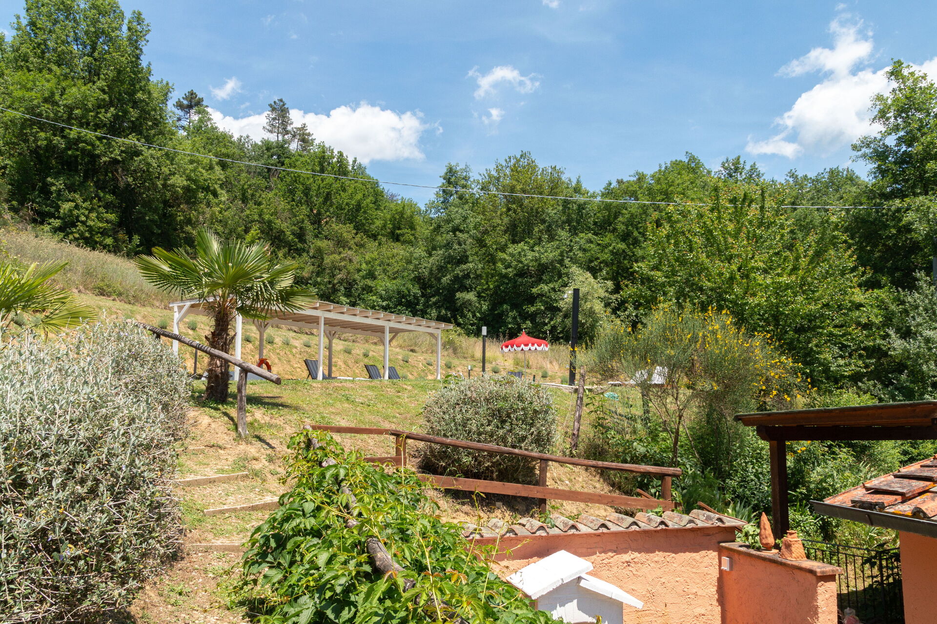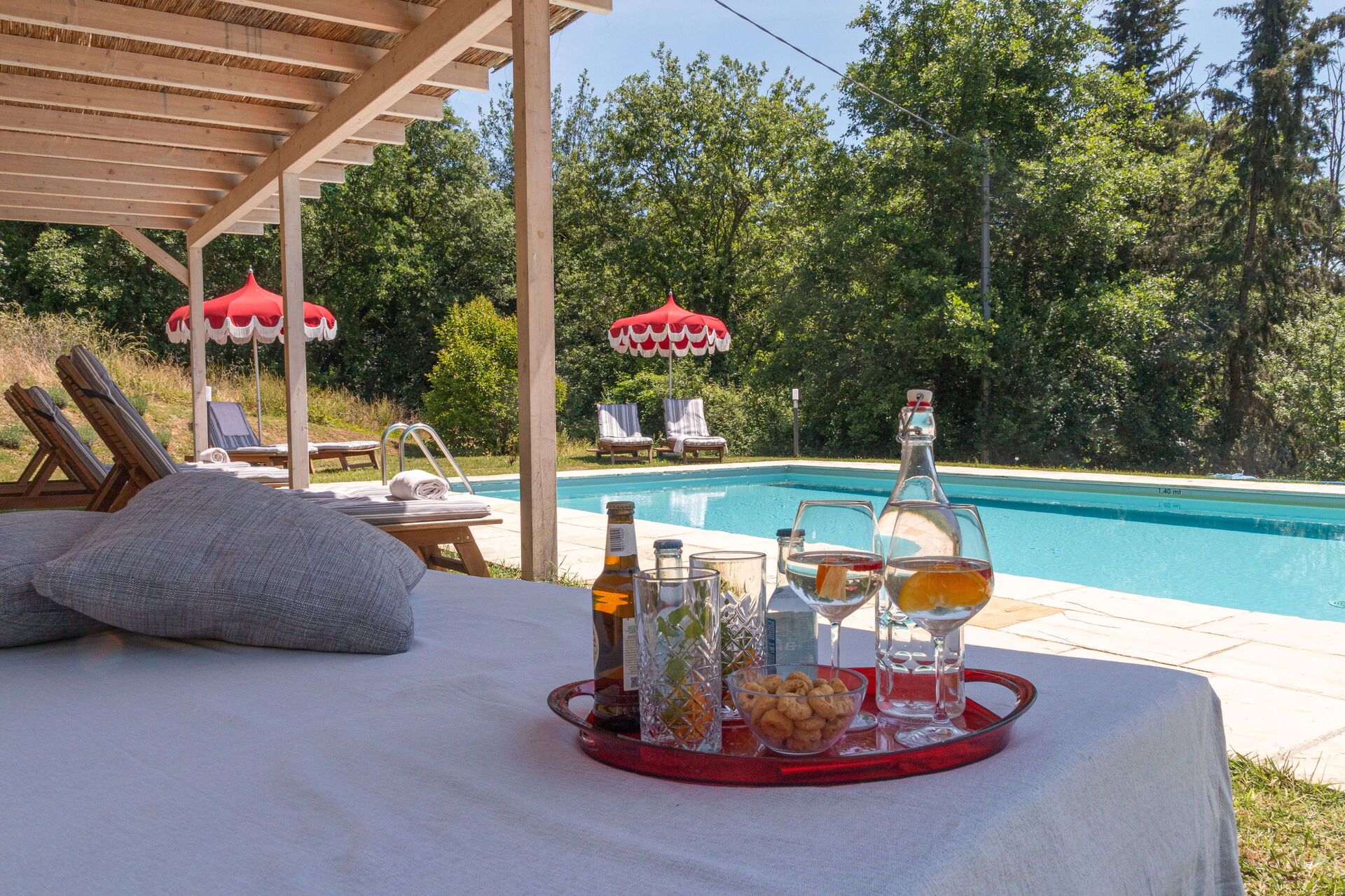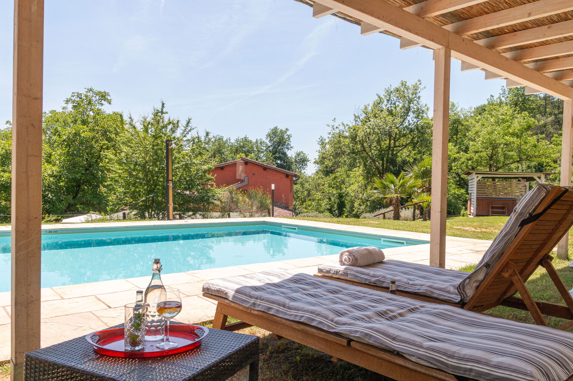 Nel grande parco a pochi passi dalla colonica, lungo il romantico torrente Il Doccio, si trova una bella e ben mantenuta piscina con lettini e tre gazebo, dove i nostri ospiti saranno accolti dall'atmosfera calma ed accogliente del verde circostante.