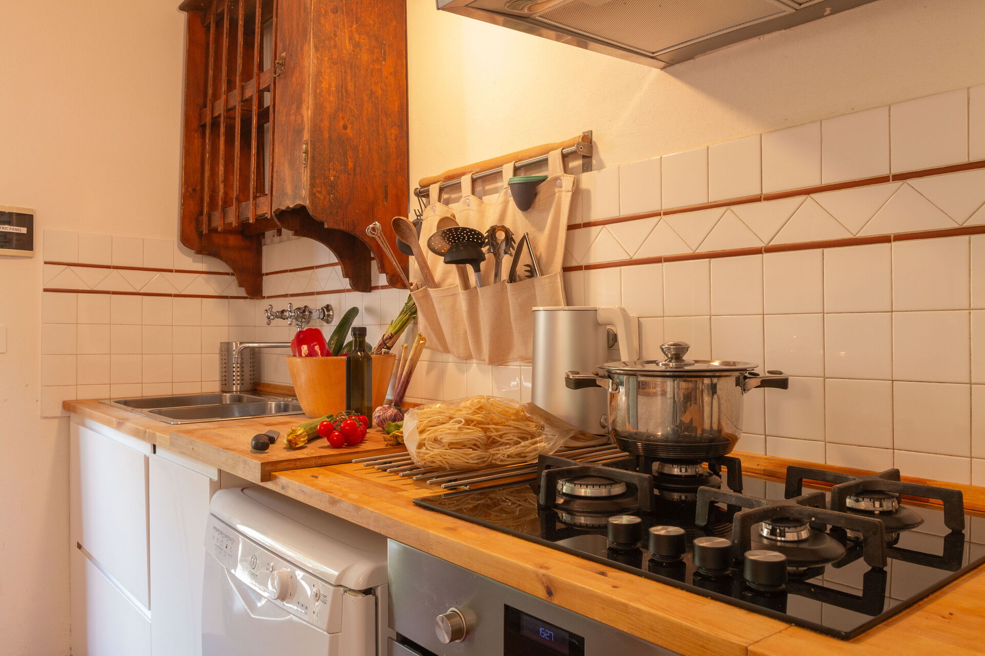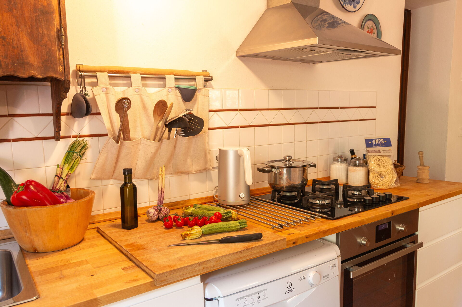 Grande cucina ben equipaggiata (forno a microonde, frigorifero/congelatore, fornelli, forno, posate, macchine da caffè/tè, utensili da cucina e prodotti di utilizzo comune come olio, sale, zucchero, caffè);