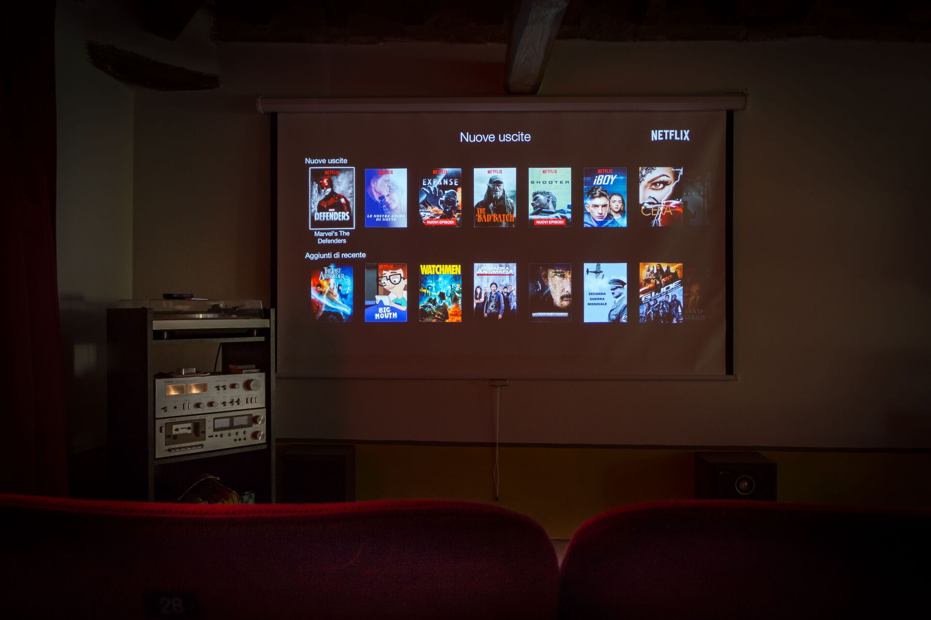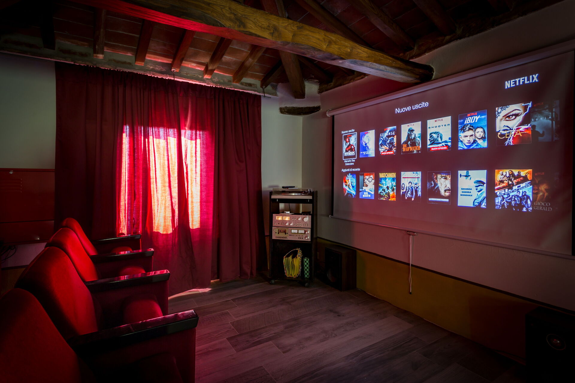 L'attico è arredato con una zona lettura con due divani e un Cinema con vere sedie vintage!