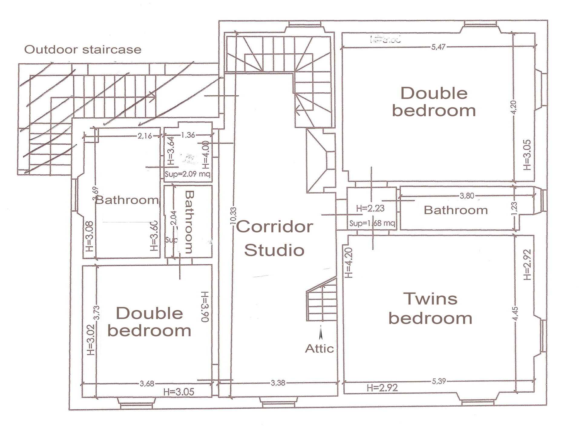 Il primo piano si apre in un corridoio con studio. Ci sono due camere matrimoniali e una camera doppia con 3 bagni su questo piano.