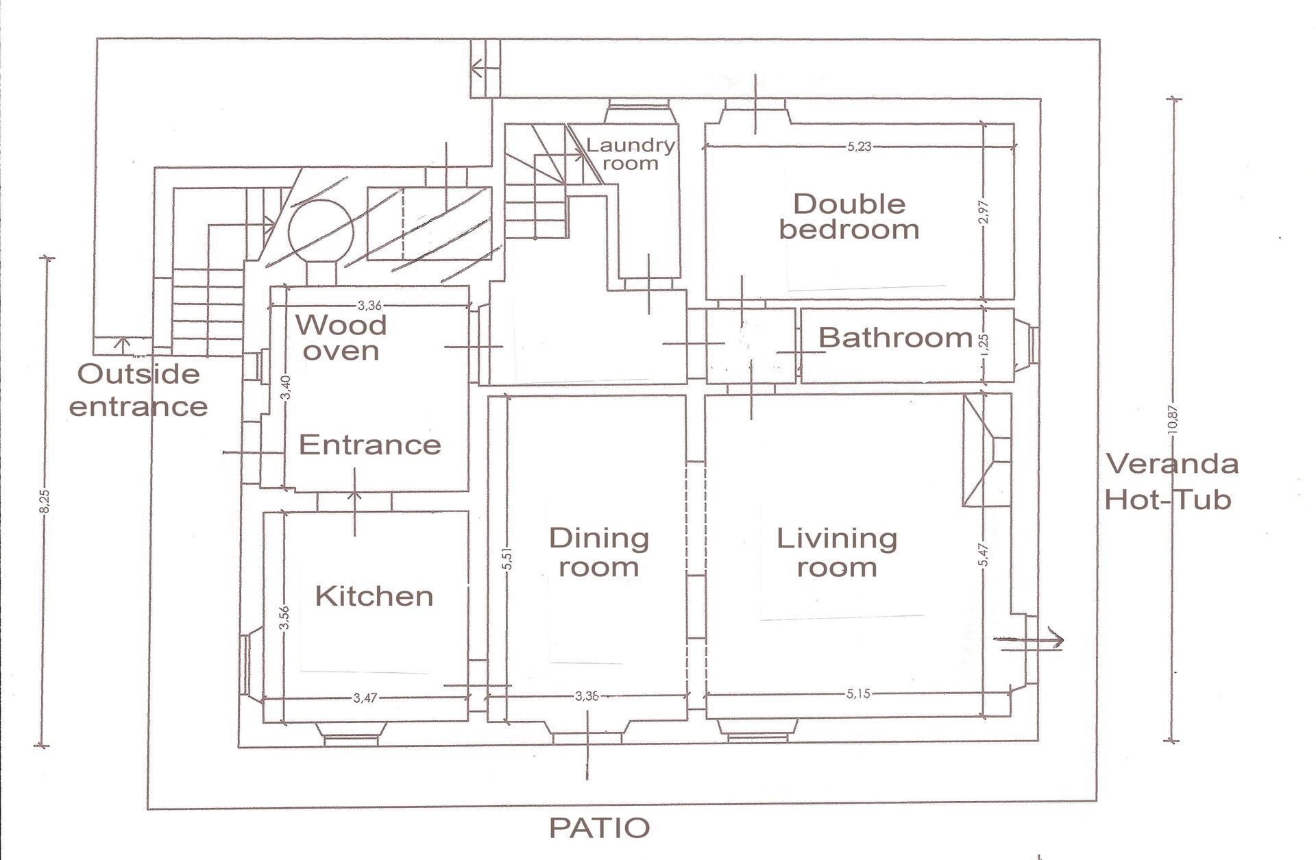 Il piano terra ha una sala da pranzo, soggiorno e una grande cucina con forno a legna. C'è anche un bagno e una camera da letto matrimoniale.